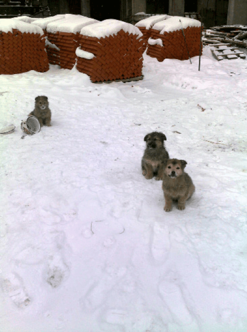 “Stray dog puppies, a bit later the same day as the above photo. I was charmed that each one had a distinct personality. To this day I’m not sure which I’d take home, thee handsome one in the front or the scrappy one in back with snow on his face.”