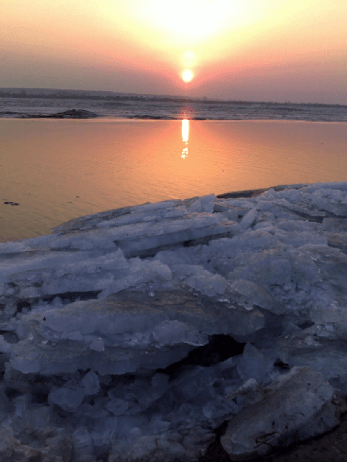 “The river gets frozen to the bottom, so as things get warmer in spring, the government accelerates the process by blowing up the river with dynamite. I went there with some friends while it was happening and we watched the water level slowly rise, later we saw that all the surrounding villages and farms were flooded and a lot of cattle died. The ice chunks piled up on shore in big heaps. That night I was leaving this German speaking club I went to sometimes and walked down and the sun was setting and the colors really struck me. The area you see with liquid water only was about half the width. What appears to be land is actually frozen river, the real bank is where those trees in the distance are.”