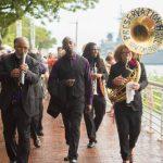 - Preservation Hall Jazz Band playing “You Are My Sunshine” in the rain as they march offstage | Photo by Joe Del Tufo for WXPN