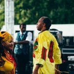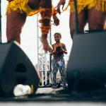 It was hard to miss the beauty even with a passing glance. Kuti himself was sporting yellow African garb, while most of his band, The Positive Force, donned vivid red. Three women decked out in intricate yellow outfits danced nonstop for the better part of an hour while also providing backing vocals and instrumentation. Altogether, the stage had 14 performers all at once. Plus, Kuti’s adorable daughter was free to roam wherever she pleased. Sometimes that meant dancing, other times it meant grabbing dad a water bottle.