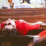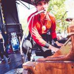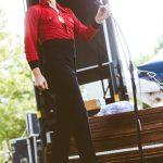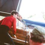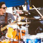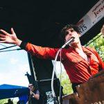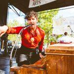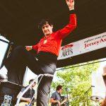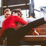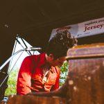 At his beloved piano Shondra, Adam Weiner hopped onto his piano bench, and with one leg extended in the air parallel with the ground, he continued to bang the keys during Low Cut Connie‘s rousing set on the Jerseyarts.com Marina Stage. Weiner isn’t about conventional playing, standing on his bench has become so ingrained in the band’s shows that his microphone extends to compensate for the added height. At one point he even stomped the keys with his feet before shimming in circles and grooving his hips to the music.