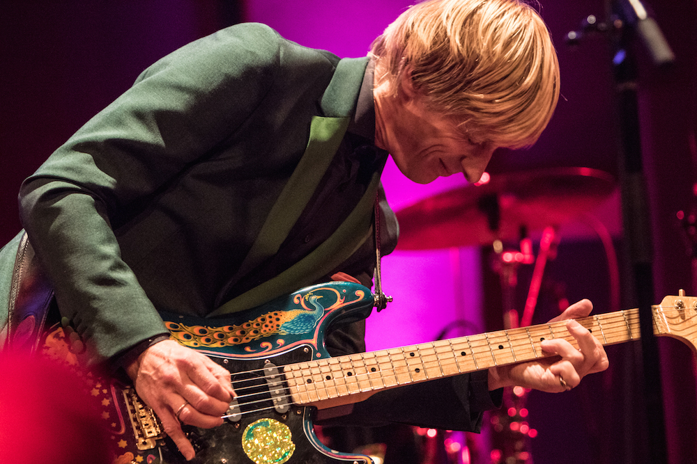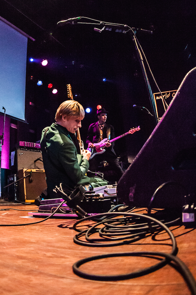 Dressed in his green suit, the animated vocalist conducted bandmates with his black-and-white Stratocaster that featured beneath the bridge the icon Om, the ancient Indian symbol of spirituality. It’s arguably challenging for western artists to pull off without pretense an overt infusion of eastern music and culture in their work: if you’re not careful (and if you’re not The Beatles), this can easily descend into the department of the disingenuous. Somehow, though, Mills can sell you on his genuine engagement, as his songwriting and performances will seamlessly hybridize sanskrit lyrical mantras, Hindu mythology and religious imagery with a healthy helping of proficient Hendrix-styled lead guitar work and radio-ready rock melody, often collecting eclectic influences from other genres too along the way.