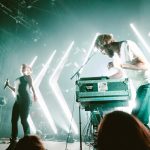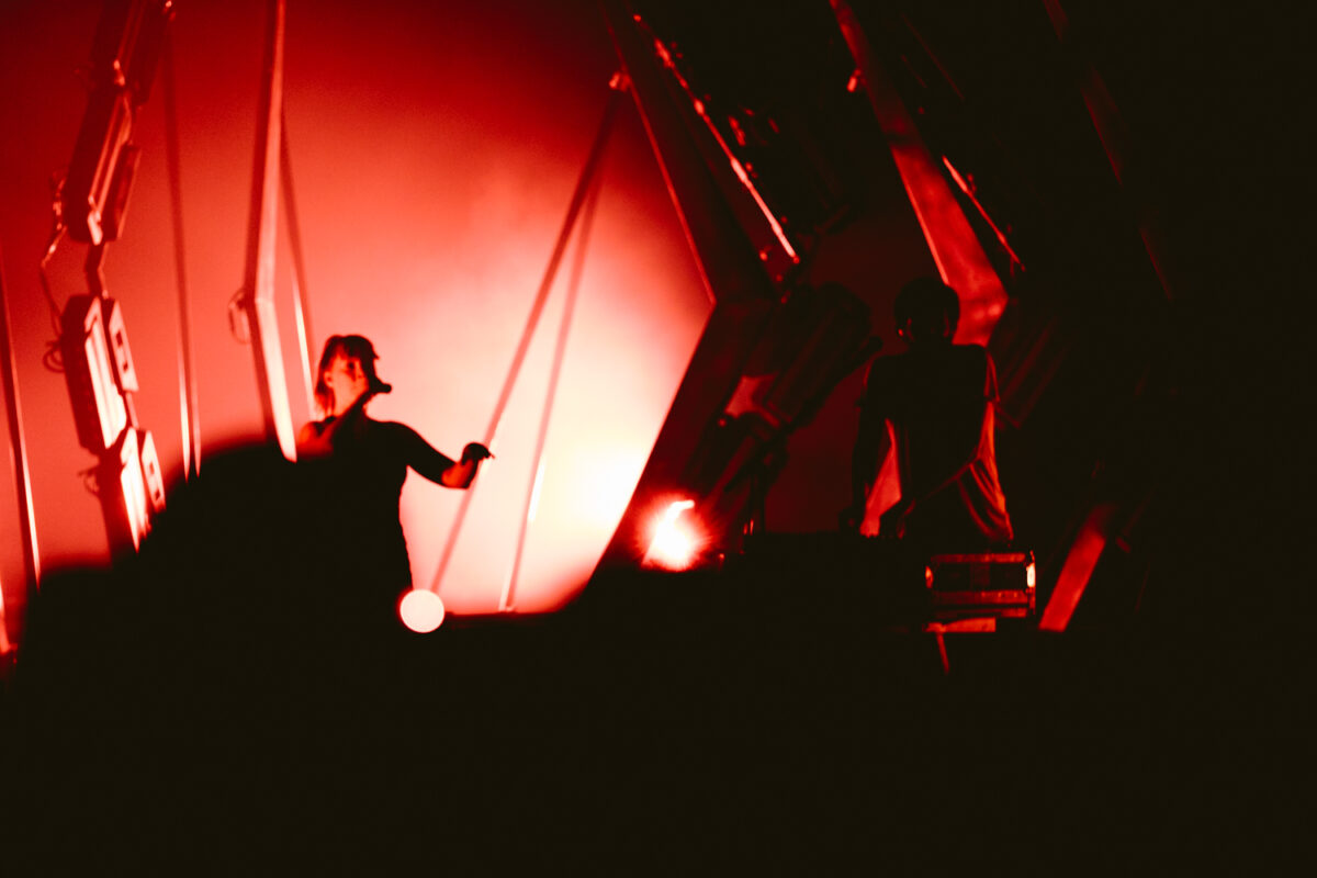 As the creaky, echoing pitches that introduce What Now‘s opening cut “Sound” weaved their way through a pitch black Union Transfer, the skeletal ribs of the band’s lighting rigs began to glow in response to the wavelengths, rising and falling in time with Nick Sanborn’s precise manipulations of synthesizers and modulators. The audience had waited long enough after seemingly endless tech delays had widened the gap after opener Lucy Dacus, and went wild as the partners on stage began to work their magic.