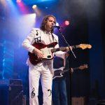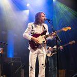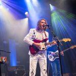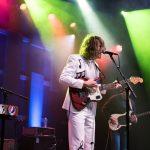 Recalling Glen Campbell’s elaborate outfits, Kevin Morby stood at the center of the World Cafe Live stage dressed in a white suit with a cascade of music notes down the side and rhinestone initials on the lapels.