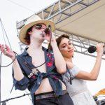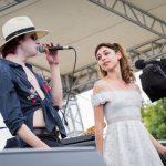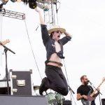 Throw away what you believe a rock show should look like because Foxygen probably just redefined it. The California duo, made up of Jonathan Rado and Sam France along with their backing band, got a little weird on the River Stage in Wiggins Park Saturday afternoon. France came out with his shirt tied up in the middle of his gut, his eyes covered by heartshaped sunglasses, his hair red and his face and all white — whether it was sunscreen or some sort of makeup/paint is TBD. Jackie Cohen, who supplied backing vocals, tried kicking a beach ball off the stage and sent her shoe with it. Neither she nor France kept still for just about the entire set. Their movement, sometimes spastic but often quite rehearsed, sent waves of energy into the crowd, which was the largest it had been in the park so far this weekend.