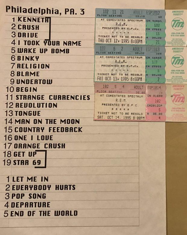Seeing R.E.M. at the Spectrum on 10/13/95 changed everything I thought about music. They did so many things that young me never thought a band selling out arenas might do. I remember hearing or reading interviews where they plainly stated that this would not be a greatest hits tour; they would be playing mostly Monster material and songs written while on tour. That night, I found that the energy of a set like that tops any nostalgia set. All of my favorite shows since then have been mostly new material. Hearing a new song for the first time in a live setting is maybe the most exciting moment of any show for me.