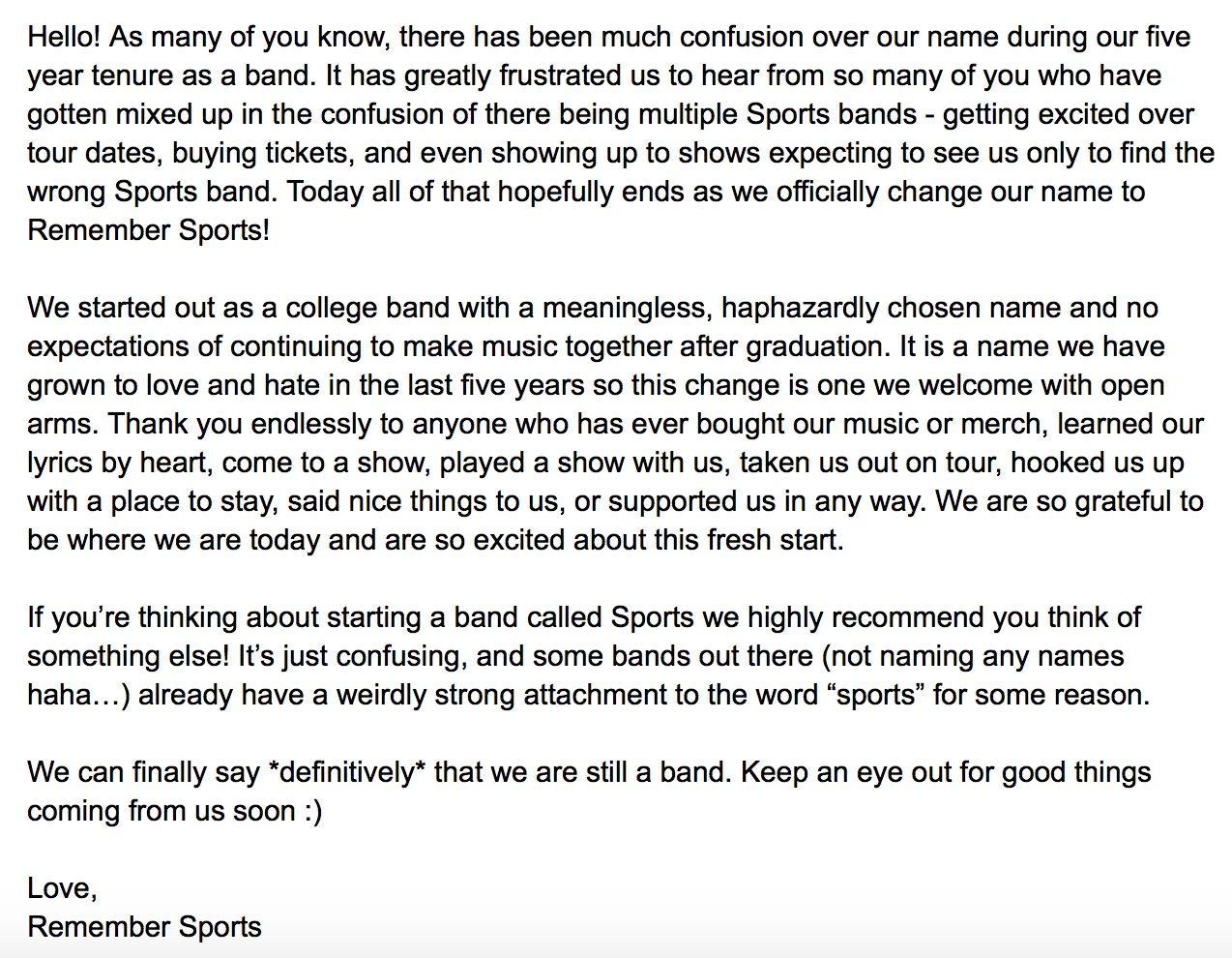 Well, friends, please stop screaming. First, because that song is a jam. Second, because Sports hears your calls for help and is taking action. This valiant move comes in the form of smacking on a permanent qualifier to their name. Without further ado, world, meet the new and improved, Remember Sports.