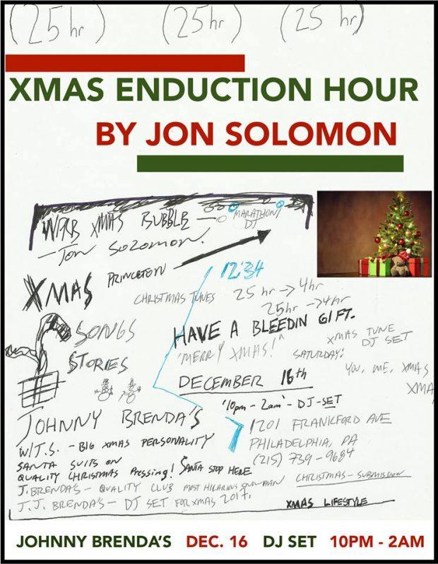 XMas Enducation Hour by Jon Solomon takes place at Johnny Brenda’s tonight from 10 p.m. to 2 a.m. Get details at the venue’s website, or via the flyer below.