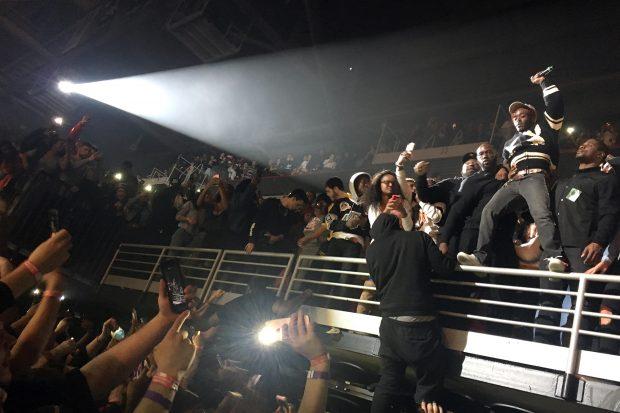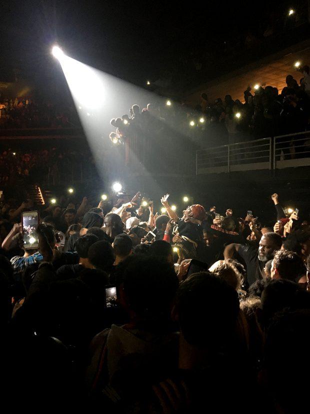 He leapt off stage right, flanked by security detail, who followed him as he scaled the collapsed bleachers along the arena’s south wall. Upon reaching the mezzanine level, Uzi balanced perilously on the railing and hyped up the crowd at his feet (which those security persons nearby, holding his ankles and making sure he didn’t slip). After a couple minutes, he slowly removed his gold chains, and handed them one by one to the bodyguards, along with his wired in ear monitor, and gestured to the crowd to circle up. And he jumped.