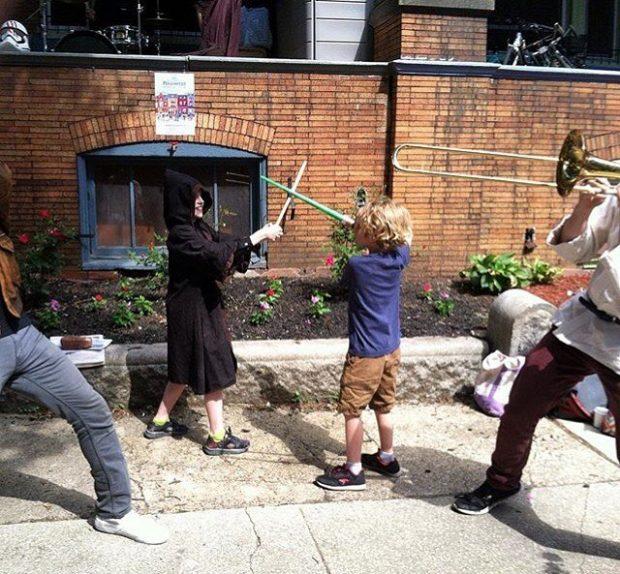 On the day of Porchfest I arrived at my ‘venue,’ met my host and their roommates and set up with my band Wookiedelphia. We were expecting to perform for the few friends we’d invited, and a small group of nerds that were interested in seeing a Star Wars-themed brass band. I was surprised that, by the end of our second song, the sidewalk was packed with neighbors, kids, dogs, and a few pretty decent cosplay outfits. By the end of the show, we had a crowd dancing on both sides of the street and two impromptu audience lightsaber duels.