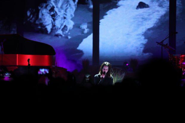 The paradoxical (and potentially frustrating) thing about Lana Del Rey in a live setting is that, despite her highly romantic and theatrical music, and her predilection for invoking larger-than-life, iconic imagery in her lyrics and visuals – represented in this case by a multi-level beach-themed set complete with palm trees, rocky outcroppings and lounge chairs, and a well-incorporated backdrop of screens presenting, largely, the kind of grainy, cinematic mid-century stock footage familiar from her music videos – she’s not at all flashy or dramatic (or even especially charismatic) as a performer. “Lana Del Rey” is, after all, a character herself – the stage name of one Elizabeth Grant, milking its evocations of faded Hollywood grandeur for all they’re worth – and her songs (not to mention her career writ large) demonstrate a clear interest in explorations of myth-making and performance. Yet the persona she projects on stage is virtually devoid of personality: she presents as a nice, courteous, mild-mannered singer-songwriter, generically grateful for her fans and her success. Which may be an entirely authentic, accurate reflection of who she is. But how boring would that be?