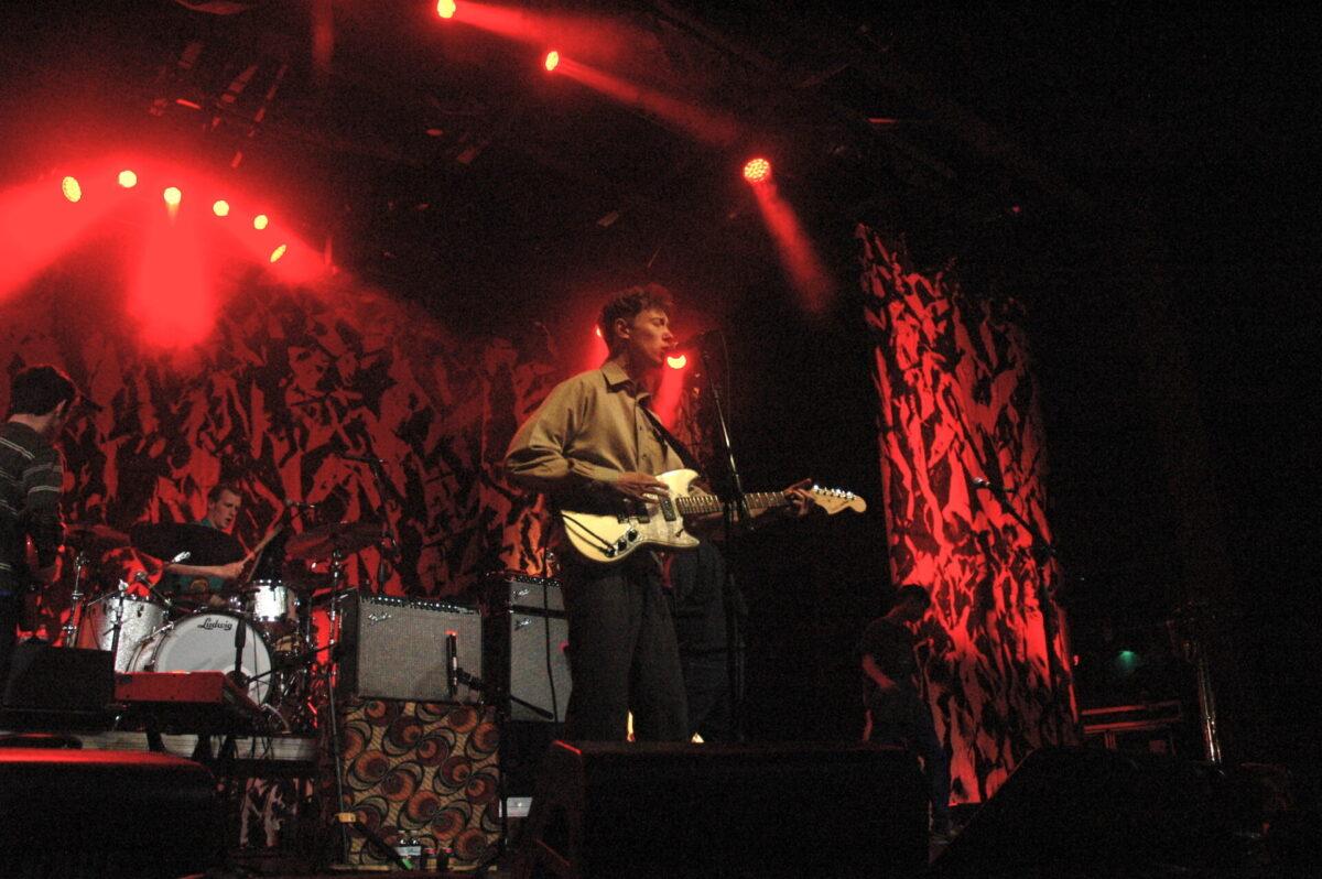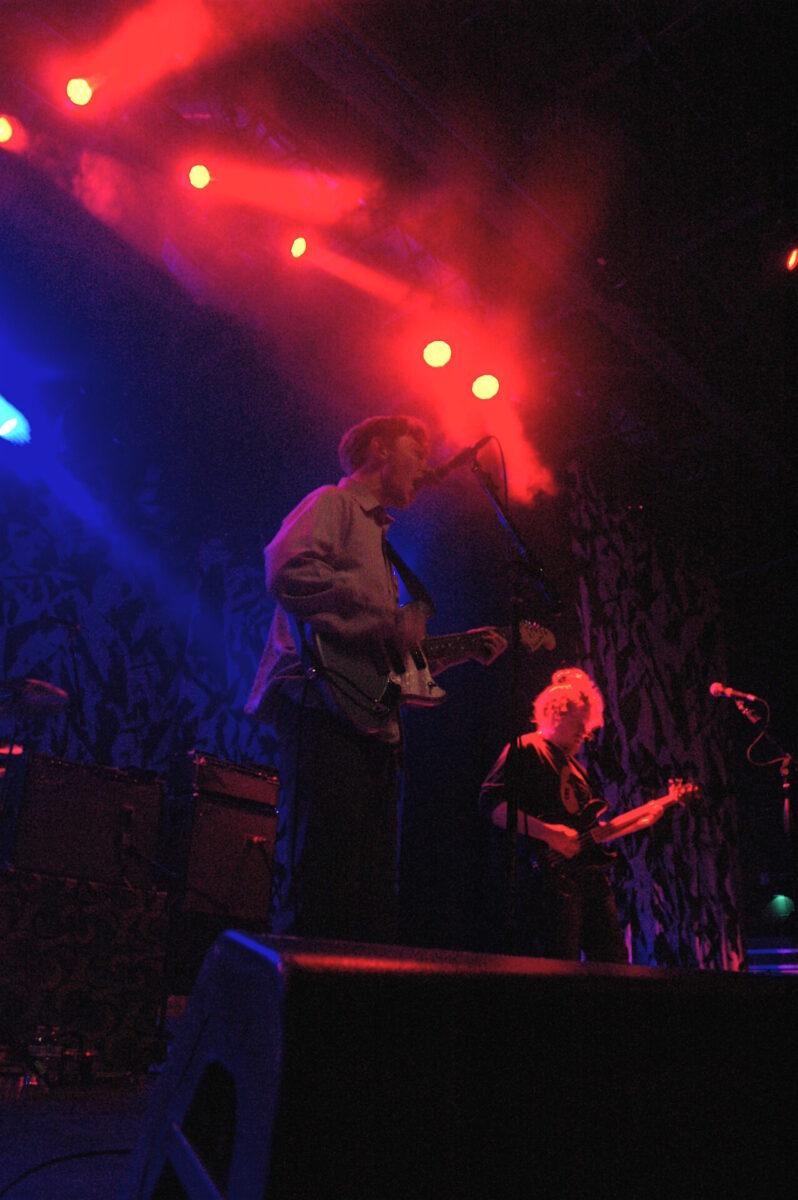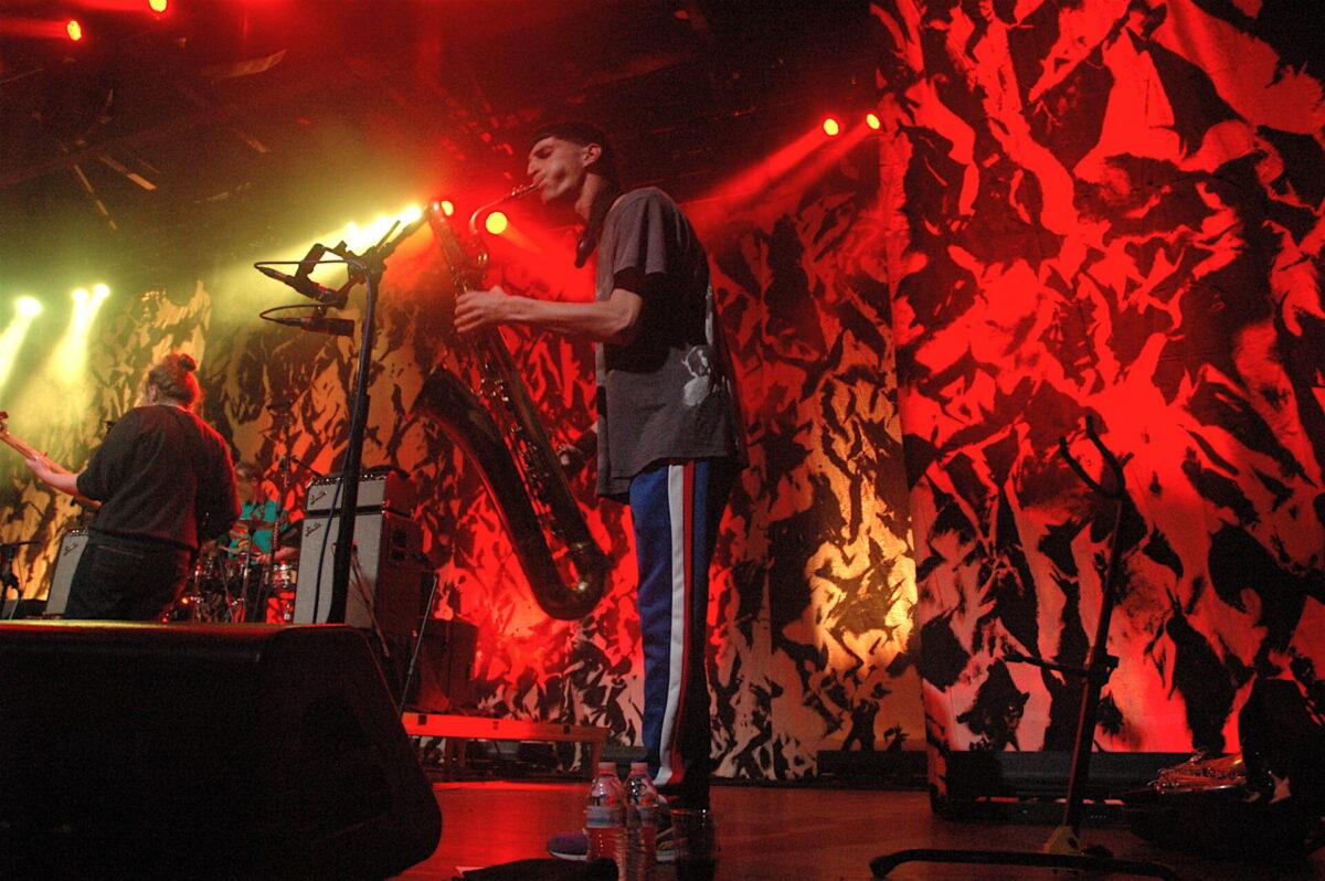 The first Ooz song to appear in the set came in the form upbeat punk rocker “Dum Surfer.” The demonic sounding track heightened the crowd’s engagement as the first mosh-inducing song of the night. The fiercely unsettling lyrics depict drunken bar encounters and fuzzy car crashes, which seem fitting when delivered by grungy vocals masked in Marshall’s unmistakably English accent. Marshall and co-vocalist/bassist James Wilson trade verses throughout the song, egging on the moshing fans in between breaths. Marshall’s gangly frame contorts, bending wildly as guitarist Jack Towell launched into a rip-roaring solo, rivaled by saxophonist Ignacio Salvadores’ wailing grooves.