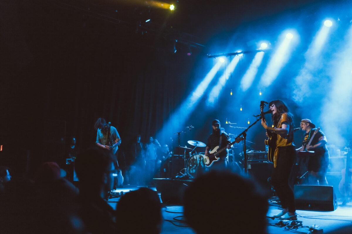Frances Quinlan sings like someone who loves singing. That’s not only to say that she has a clear talent for it, but also that her inflections are often adapted throughout Hop Along‘s performances — ever-changing, evolving, so songs always sound fresh and vibrant. At the band’s sold out headlining show at Union Transfer this Saturday night, in celebration of their new album Bark Your Head Off, Dog, hushed words became screaming anthems, better suited for live performance but also providing texture over the harmonies provided by Thin Lips’ Chrissy Tashjian. In addition to the band, the show featured low-hanging lights casting a moody glow on the stage, as well as guest appearances from the Philly band’s peers and friends (Kyle Pulley on tambourine, Cat Park on vocals), and a newly-brewed Hop Along IPA from nearby Love City Brewing on tap at the bar.