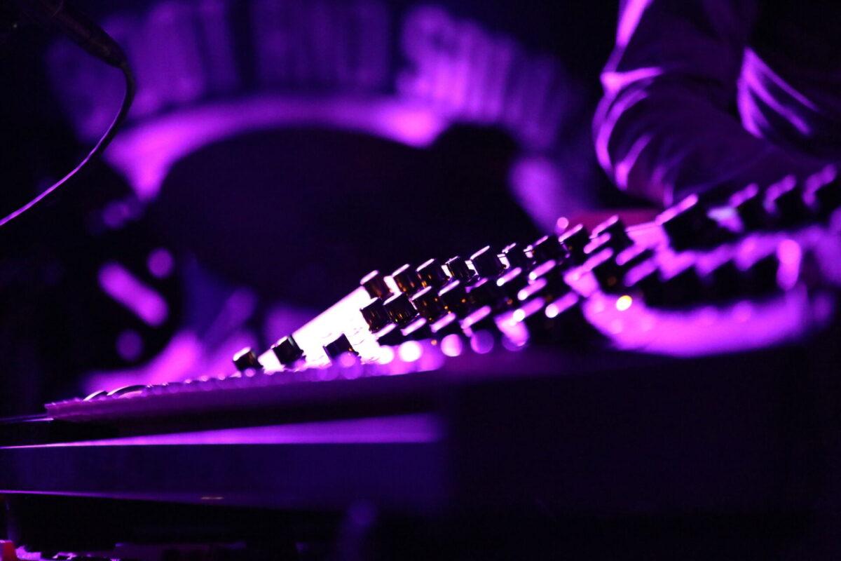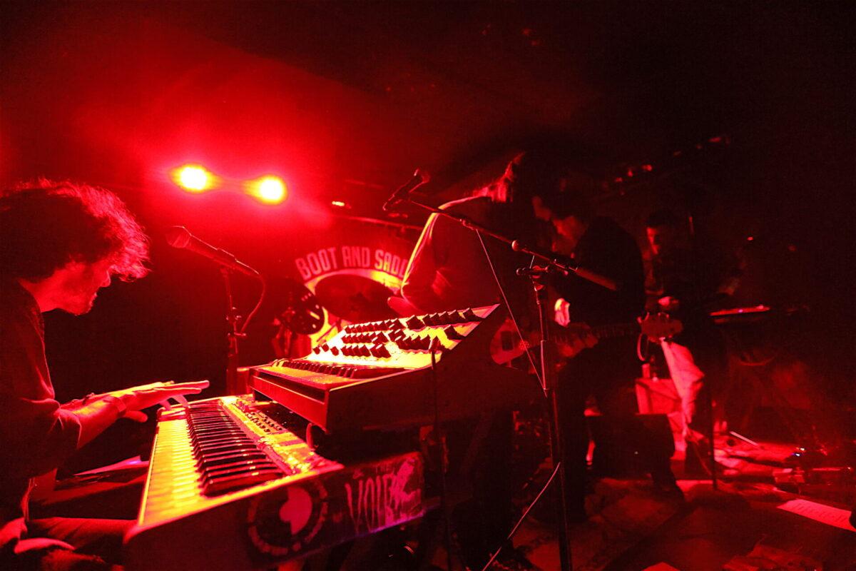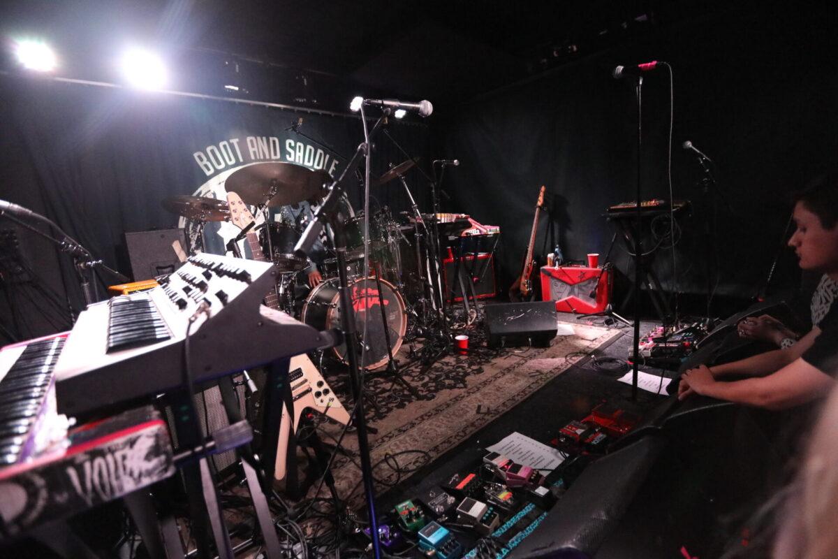 Inventory time: there’s Moog/Korg keyboard tower at stage right, the bright red amp with childlike illustrations on stage left, a good half dozen guitars floating around (the Flying V being an eye popping one), an inexplicable network of effects pedals and processor units lining the edge of the stage (one of which I’m pretty certain was not connected to anything) — suffice it to say, there is a lot of SOUND at this gig, and a lot of things with which to make it. I wonder how much The Voidz considered just leaving it all stored at the Boot to make load-in easier every week.