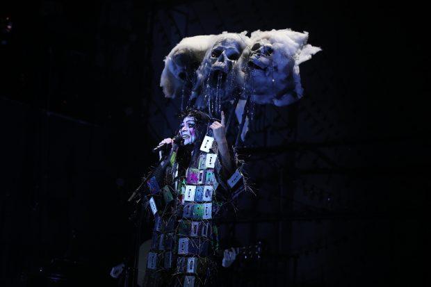 Throughout the entire show, and to varying degrees of fanfare, one musician left the stage at the end of every hour/decade. This meant that what had begun as a 24-member ensemble back in 1776 was, by 1986, whittled down to a trio; a gradual devolution whose effects were not always evident in real-time, even though there were plenty of memorable contributors (the phenomenal trumpet soloist Greg Glassman, for one) lost along the way. By the era of the AIDS crisis, however – a tragedy for which this device also served as an implicit metaphor – the effects of the diminished musical palette were undeniable: a stripped-down, transitional (and obviously thematically redolent) “Love Will Tear Us Apart” marked the departure of drummer Bernice “Boom Boom” Brooks, and we were left with just Mac (cloaked in a robe of cassette tapes, beneath a haunting troika of tinsel-teared skull masks), pianist Ray and guitarist Viva DeConcini to carry us on through the crisis. The tragic aftermath of the previous decade’s liberated sexual expression – but also the consequence of the previous two hundred-plus years of oppression and discrimination – AIDS formed the subtext for every song performed in the 1986-’96 segment, most of them relatively lesser-known selections from cult-favorite singer-songwriters: Suzanne Vega (“Blood Makes Noise”), Mary Margaret O’Hara (the magnificently poignant “Body’s in Trouble”), Tori Amos (“Precious Things.”) The closest this segment got to the pop charts was Robert Palmer’s “Addicted to Love” – its verses interpolated with Diamanda Galas’ caustic, pointedly topical spoken-word piece “Let’s Not Chat About Despair.” And the decade’s centerpiece was a triptych of songs written by gay male songwriters who were out at the time – a feat to assemble, Mac explained, as there were so few of them – including Marc Almond’s moving “There Is A Bed” (illustrated by a series of bedsheets sporting Keith Haring-esque line drawings) and the simultaneously hilarious and eviscerating “Denny (Naked)” by the queercore band Pansy Division.