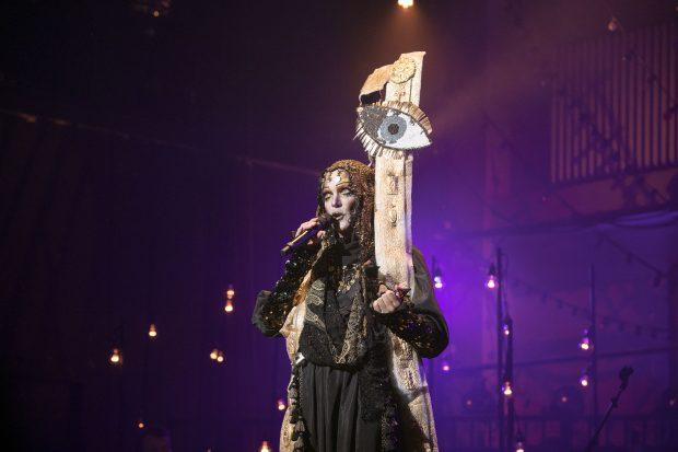When it comes to the 1960s, of course, historical and cultural significance would be hard to avoid even if you tried. The 1956-66 decade – which focused, naturally enough, on the Civil Rights Movement (more specifically, the 1963 March on Washington and its queer co-organizer Bayard Rustin) – opened with a pop-art bang: Mac floating high above the stage on the wings of a comic-book finger-snap, in a dress that combined Lichtenstein, Warhol, Jasper Johns and Jackie O, singing the lyrics of “Turn! Turn! Turn!” to the driving beat of the “Peter Gunn” theme. (This moment also marked the halfway point of the day’s performance, or the three-quarter-mark of the show as a whole.) From there on, there was a clear resonance to both the more obvious picks (The Staple Singers’ “Freedom Highway”; a thunderous tear through Nina Simone’s “Mississippi Goddamn”) and the less overtly political likes of James Brown’s “Think,” the Supreme’s “You Keep Me Hangin’ On” (one of several tours-de-force from backup vocalists Thornetta Davis and Steffanie Christi’an) and “Don’t Let Me Be Misunderstood” (a brilliant song choice for a segment in which we white audience members were invited to exorcise our white guilt by performing it at exaggerated length.) The decade’s biggest revelation, though, was a solemn and quietly searing rendition of Dylan’s “A Hard Rain’s A-Gonna Fall” – all five vitally evocative verses of it.