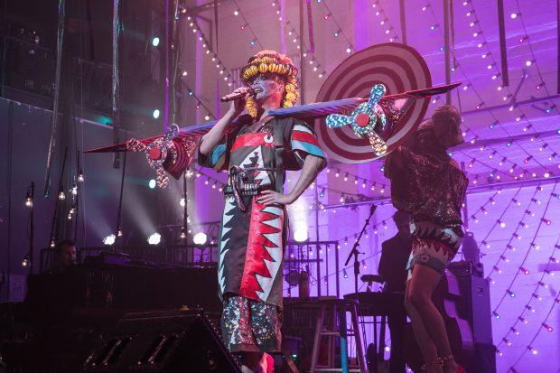 Throughout the entire show, and to varying degrees of fanfare, one musician left the stage at the end of every hour/decade. This meant that what had begun as a 24-member ensemble back in 1776 was, by 1986, whittled down to a trio; a gradual devolution whose effects were not always evident in real-time, even though there were plenty of memorable contributors (the phenomenal trumpet soloist Greg Glassman, for one) lost along the way. By the era of the AIDS crisis, however – a tragedy for which this device also served as an implicit metaphor – the effects of the diminished musical palette were undeniable: a stripped-down, transitional (and obviously thematically redolent) “Love Will Tear Us Apart” marked the departure of drummer Bernice “Boom Boom” Brooks, and we were left with just Mac (cloaked in a robe of cassette tapes, beneath a haunting troika of tinsel-teared skull masks), pianist Ray and guitarist Viva DeConcini to carry us on through the crisis. The tragic aftermath of the previous decade’s liberated sexual expression – but also the consequence of the previous two hundred-plus years of oppression and discrimination – AIDS formed the subtext for every song performed in the 1986-’96 segment, most of them relatively lesser-known selections from cult-favorite singer-songwriters: Suzanne Vega (“Blood Makes Noise”), Mary Margaret O’Hara (the magnificently poignant “Body’s in Trouble”), Tori Amos (“Precious Things.”) The closest this segment got to the pop charts was Robert Palmer’s “Addicted to Love” – its verses interpolated with Diamanda Galas’ caustic, pointedly topical spoken-word piece “Let’s Not Chat About Despair.” And the decade’s centerpiece was a triptych of songs written by gay male songwriters who were out at the time – a feat to assemble, Mac explained, as there were so few of them – including Marc Almond’s moving “There Is A Bed” (illustrated by a series of bedsheets sporting Keith Haring-esque line drawings) and the simultaneously hilarious and eviscerating “Denny (Naked)” by the queercore band Pansy Division.