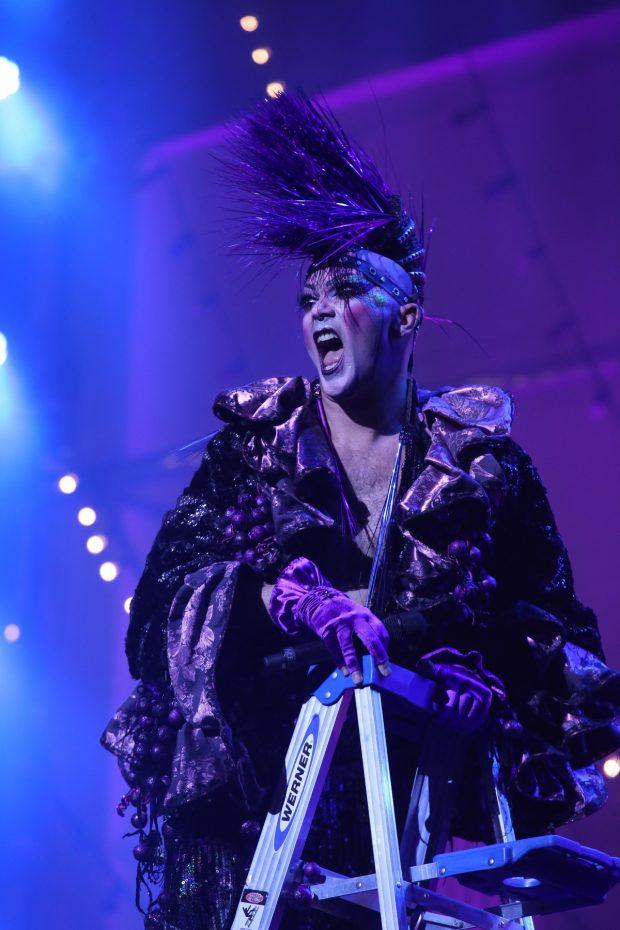From that point on – following a palette-cleansing, crowd-hyping guest appearance from the Camden Sophisticated Sisters (and Distinguished Brothers) drill team and the Almighty Sound Percussion Drumline – the show’s trajectory became increasing narrow and pointed, with the final five decades focused almost exclusively on queer history. Save for the aforementioned bit of Cold War cock-sparring (which, you know, was not exactly not queer), there was virtually no overt mention of larger national or global history from 1966 to the present. 1966-1976, of course, brought us to the decade of Stonewall riots and the gay liberation that followed, a historical narrative which Mac presented largely reverently albeit with a surprising amount of mainstream classic rock: “Born To Run” sounded the keynote (with “Marsha” – as in Johnson – subbed in for “Wendy”); “Goodbye Yellow Brick Road,” naturally, served as the processional for a symbolic reenactment of Judy Garland’s funeral (wherein audience-sourced pallbearers carried an audience-sourced Garland through the theater while black-veiled Minions scattered rose petals); a full-blooded “Gimme Shelter” soundtracked the uprising itself (after “White Riot” was cut short for being insufficiently intersectional), and Bowie’s “Oh! You Pretty Things” signaled the celebratory aftermath. (The only real curveball came with the strange sci-fi reverie of Patti Smith’s “Birdland,” performed in near-darkness with a stark spotlight on Mac’s disco-ball headdress.) As the decade ended I was back onstage again, for the final time, slow-dancing with a same-sex stranger (along with everybody else in the audience) to an ironic “appropriation” of Ted Nugent’s flamboyantly homophobic “Snakeskin Cowboys” – a song Nugent openly admits was written about the “fun” of gay-bashing – recast as a romantic “gay junior prom” ballad.