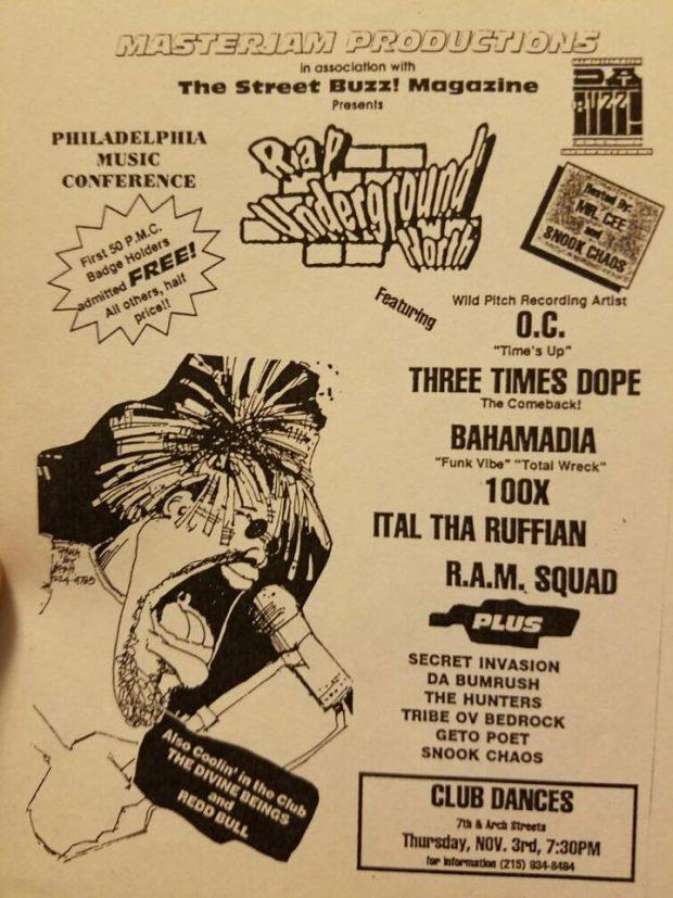 Before Bill Clinton signed the Telecommunications act in 1996 that would essentially restructure radio as we knew it, allowing for large corporations to buy up smaller, formerly independent stations, FM radio was much more autonomous and specialized. DJs and program directors were free to tailor their playlists to the tastes of their local audiences. This was a stark contrast to today’s airwaves that are essentially dominated by narrow corporate-dictated Top 40 playlists. Late night Hip Hop mix shows like Power 99’s Radioactive, WPRB’s legendary Vibes & Vapors, Q-102’s Hip Hop Revue and many others infected our ears with the freshest sounds from both national and local acts. By this time, a host of amazing local acts were trying to make their way through the notoriously competitive rap scene. With my tape deck set to record, these mix shows stretched my imagination and deepened my understanding of what was happening in my city’s music scene. In the brief breaks between the music, we were kept in the loop by advertisements for underground rap shows at Club Dances, Space/Motion on Front Street, the famed West Philly Punk venue The Fake House and the legendary Philly Woodstock (it was exactly what it sounds like, dozens of Philly Rap groups performing at an all-day DIY festival, Woodstock style). In addition to many artists from New York, Oakland, LA and Chicago that I loved as a teenager, a great deal of homegrown underground Philly rap had begun taking up considerable space in my walkman.