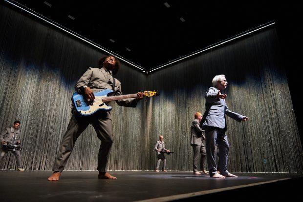 For one thing, the much-discussed staging of the show — a large rectangle empty of amplifiers and typical production clutter, grey walls of strung beads (that look not unlike a much larger scale version of the Johnny Brenda’s walls), and a dozen musicians clad in grey and performing barefoot — absolutely lived up to the hype. The blank canvas approach allowed them to use theatrical lighting to frame the open space in all sorts of imaginative ways. It was a classroom, as Bryne sat at a desk, gesturing to a model of a human brain on the pulsing opener “Here” from this year’s American Utopia; it was a dark living room as he stared into a purple glow resembling a screen on “I Should Watch TV” from his St. Vincent collaboration, Love This Giant; it was a hall of shadows on a rendition of “Blind” by Talking Heads.