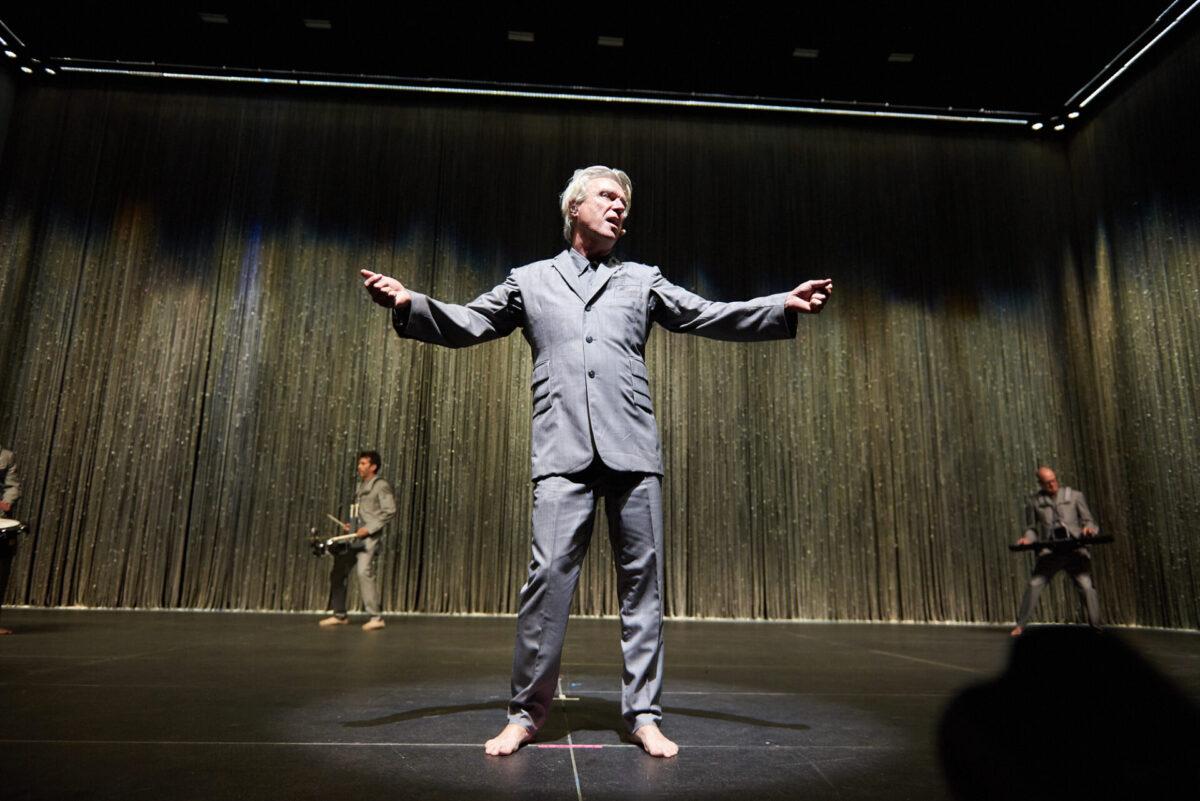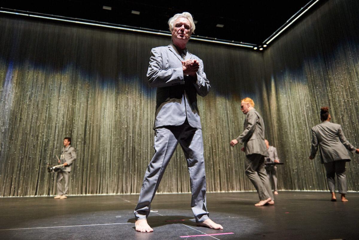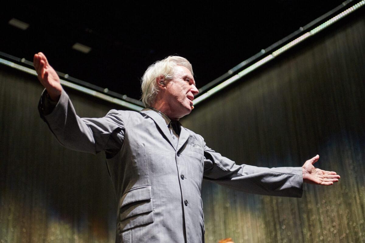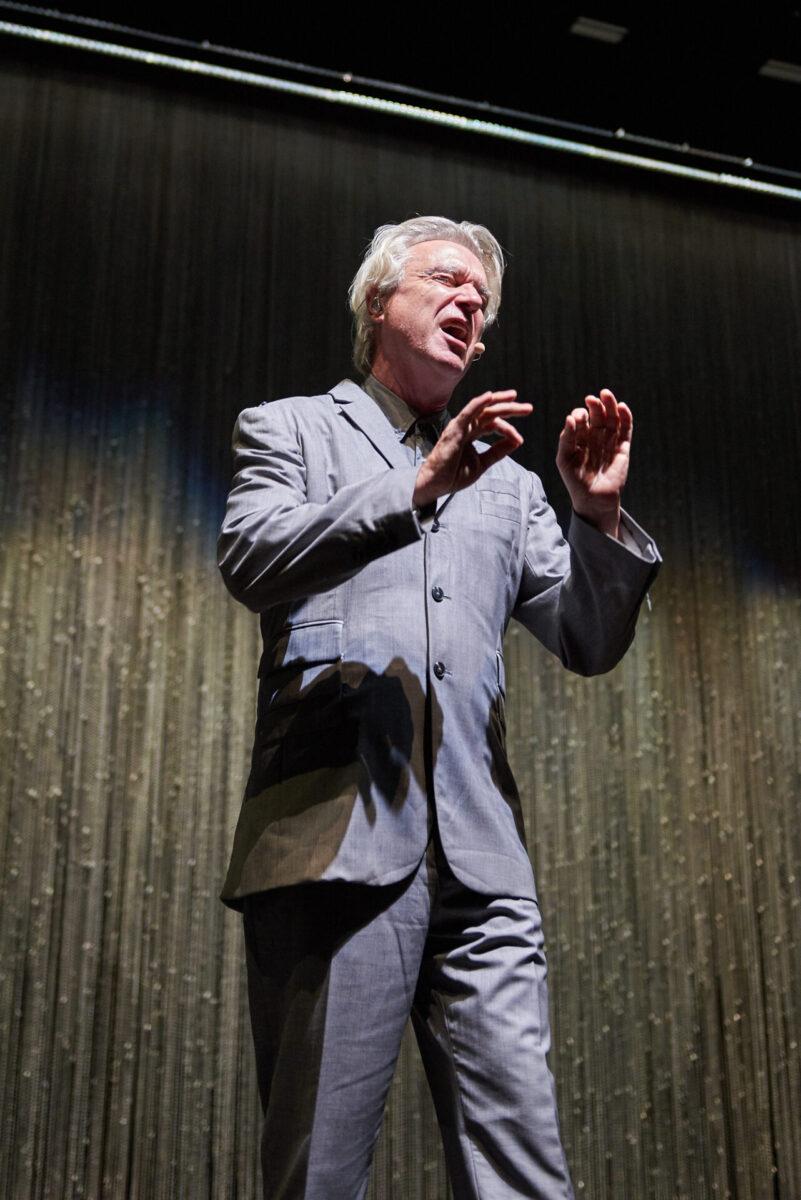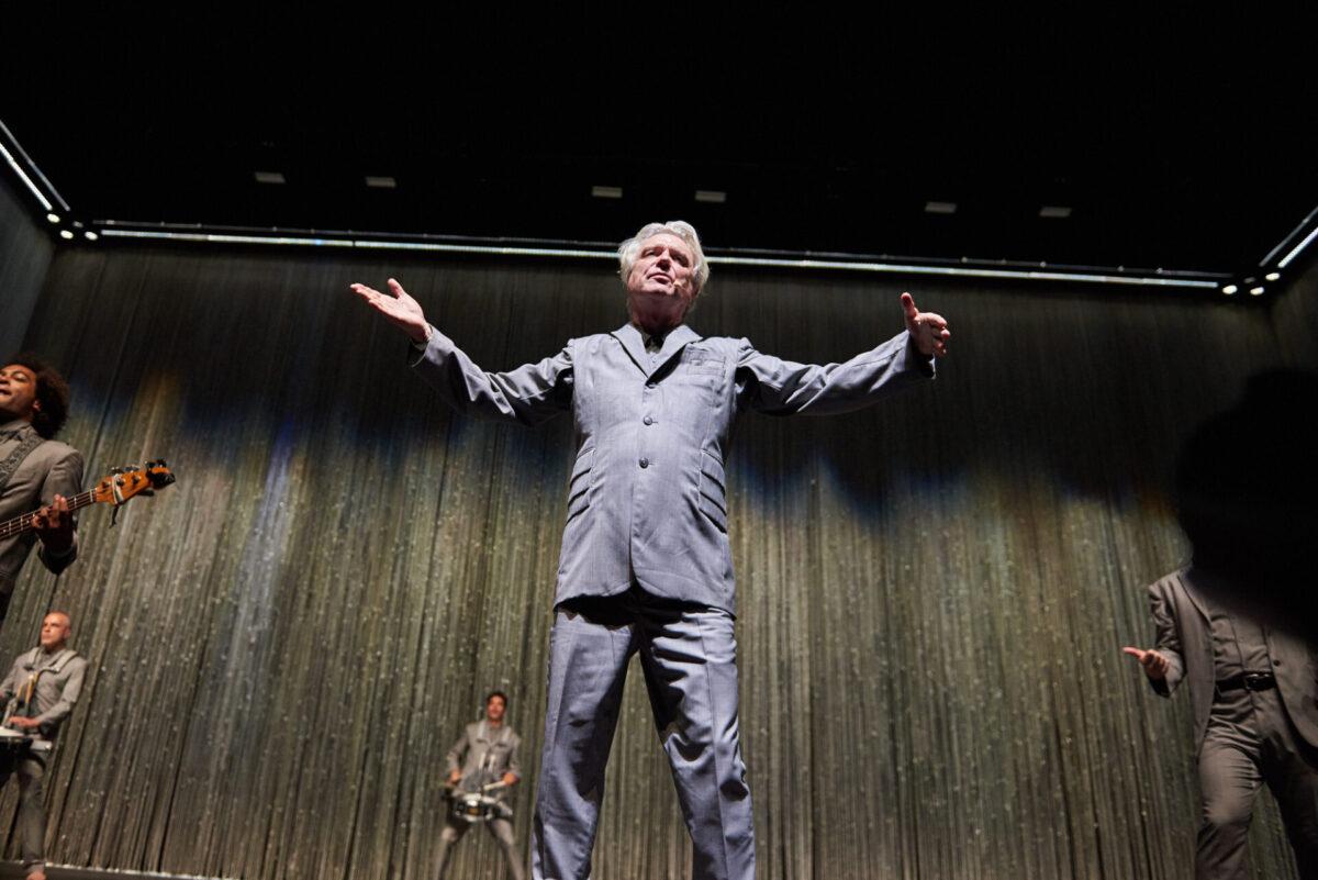 For one thing, the much-discussed staging of the show — a large rectangle empty of amplifiers and typical production clutter, grey walls of strung beads (that look not unlike a much larger scale version of the Johnny Brenda’s walls), and a dozen musicians clad in grey and performing barefoot — absolutely lived up to the hype. The blank canvas approach allowed them to use theatrical lighting to frame the open space in all sorts of imaginative ways. It was a classroom, as Bryne sat at a desk, gesturing to a model of a human brain on the pulsing opener “Here” from this year’s American Utopia; it was a dark living room as he stared into a purple glow resembling a screen on “I Should Watch TV” from his St. Vincent collaboration, Love This Giant; it was a hall of shadows on a rendition of “Blind” by Talking Heads.
