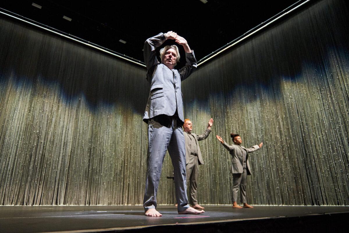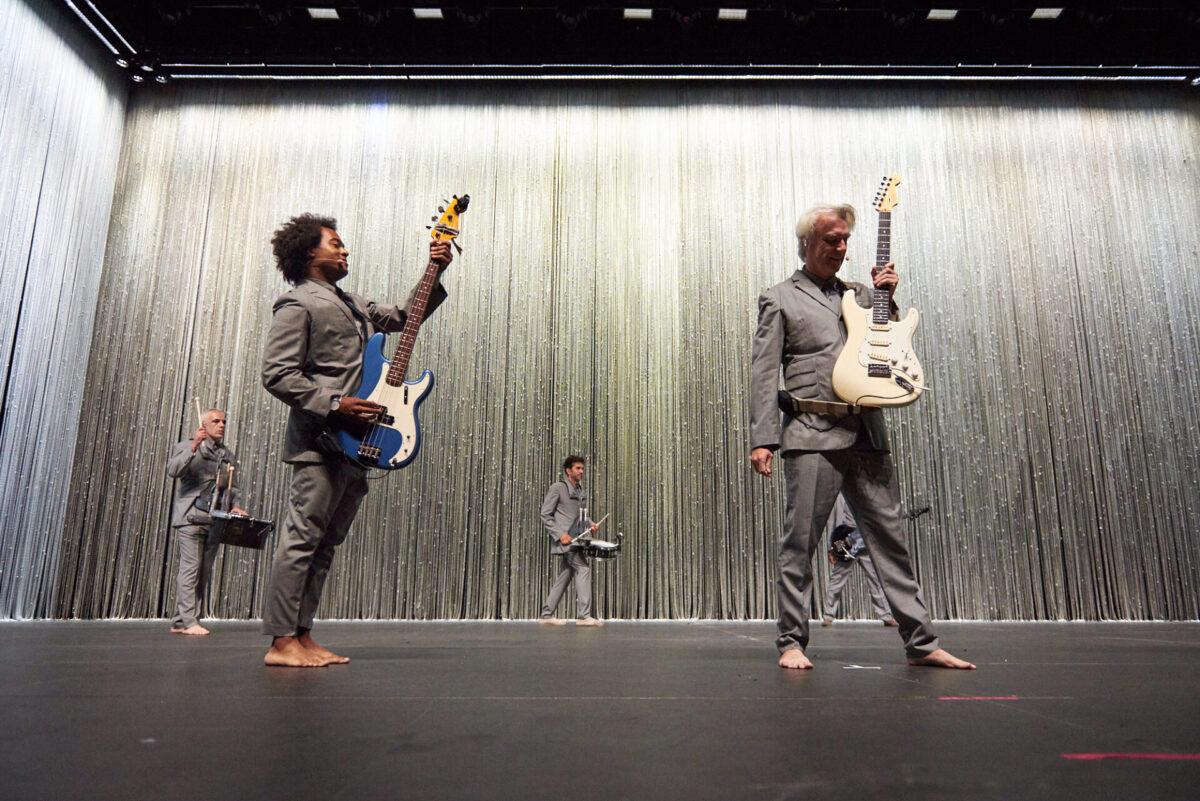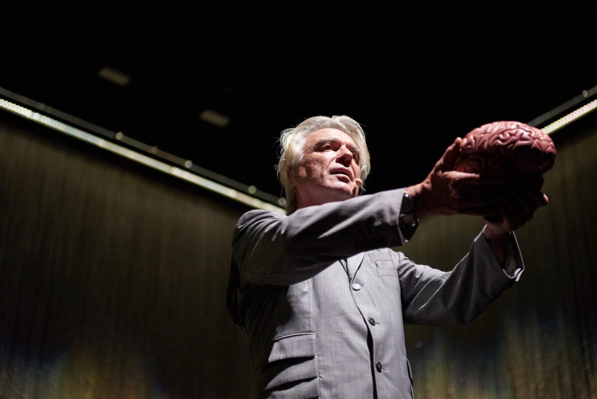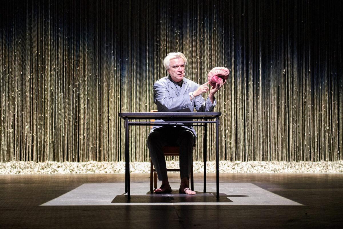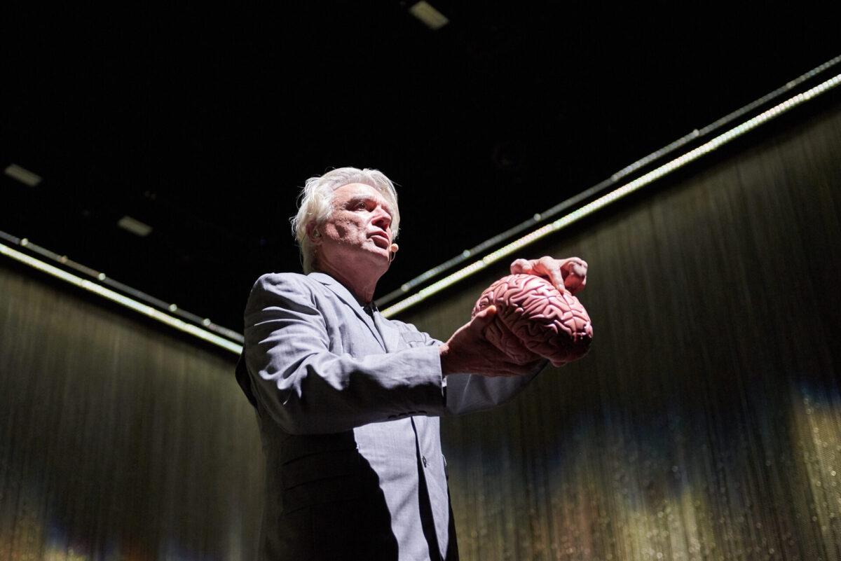 For one thing, the much-discussed staging of the show — a large rectangle empty of amplifiers and typical production clutter, grey walls of strung beads (that look not unlike a much larger scale version of the Johnny Brenda’s walls), and a dozen musicians clad in grey and performing barefoot — absolutely lived up to the hype. The blank canvas approach allowed them to use theatrical lighting to frame the open space in all sorts of imaginative ways. It was a classroom, as Bryne sat at a desk, gesturing to a model of a human brain on the pulsing opener “Here” from this year’s American Utopia; it was a dark living room as he stared into a purple glow resembling a screen on “I Should Watch TV” from his St. Vincent collaboration, Love This Giant; it was a hall of shadows on a rendition of “Blind” by Talking Heads.