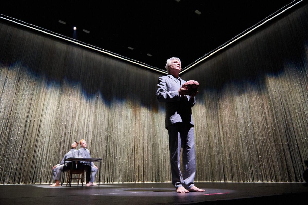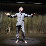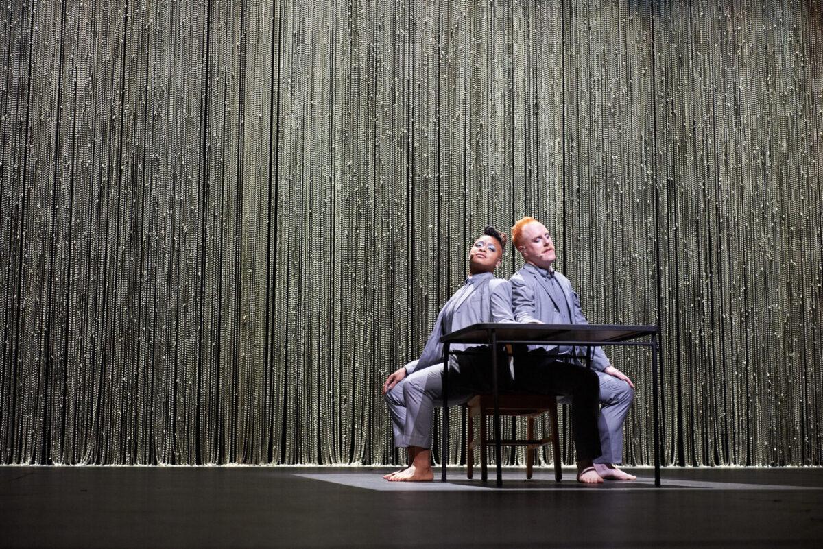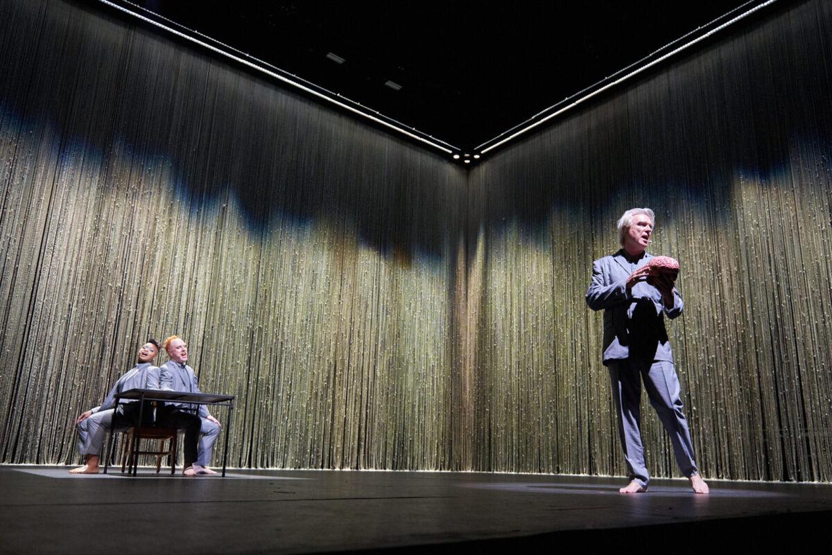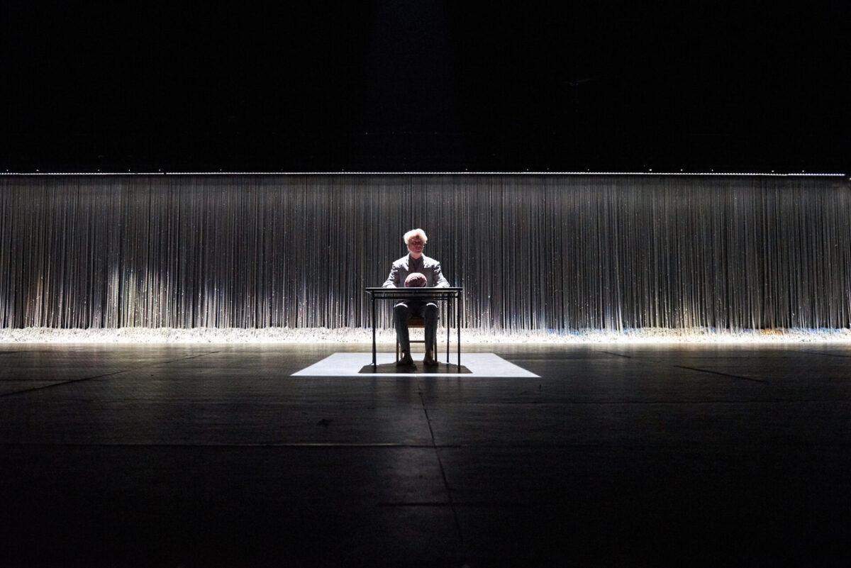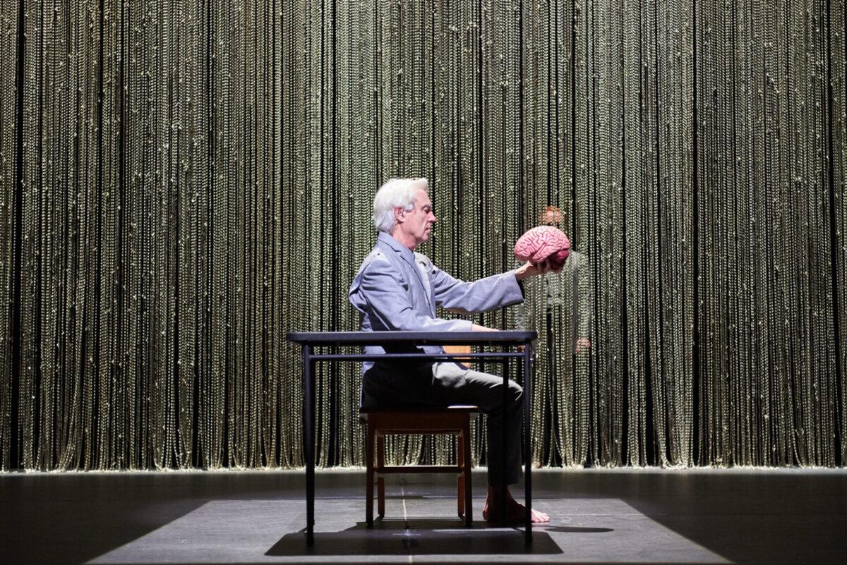 For one thing, the much-discussed staging of the show — a large rectangle empty of amplifiers and typical production clutter, grey walls of strung beads (that look not unlike a much larger scale version of the Johnny Brenda’s walls), and a dozen musicians clad in grey and performing barefoot — absolutely lived up to the hype. The blank canvas approach allowed them to use theatrical lighting to frame the open space in all sorts of imaginative ways. It was a classroom, as Bryne sat at a desk, gesturing to a model of a human brain on the pulsing opener “Here” from this year’s American Utopia; it was a dark living room as he stared into a purple glow resembling a screen on “I Should Watch TV” from his St. Vincent collaboration, Love This Giant; it was a hall of shadows on a rendition of “Blind” by Talking Heads.