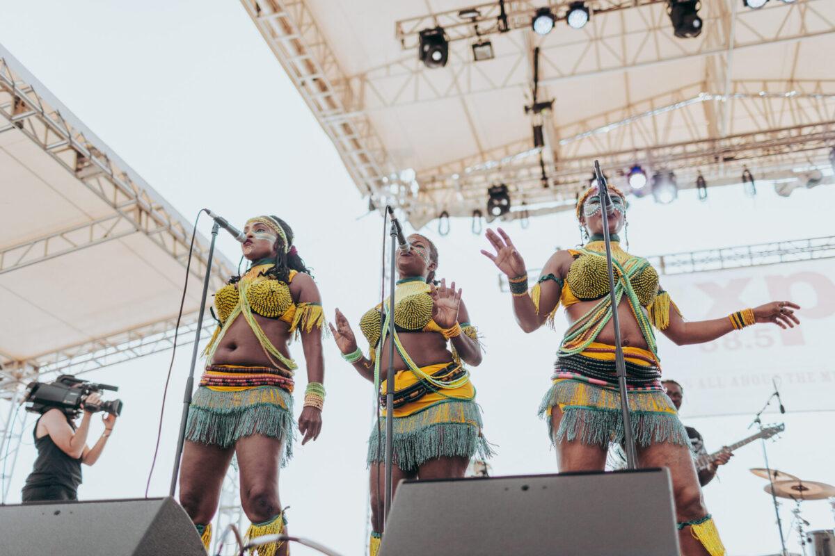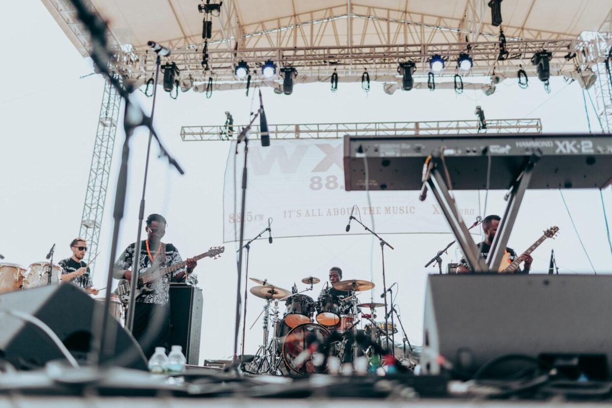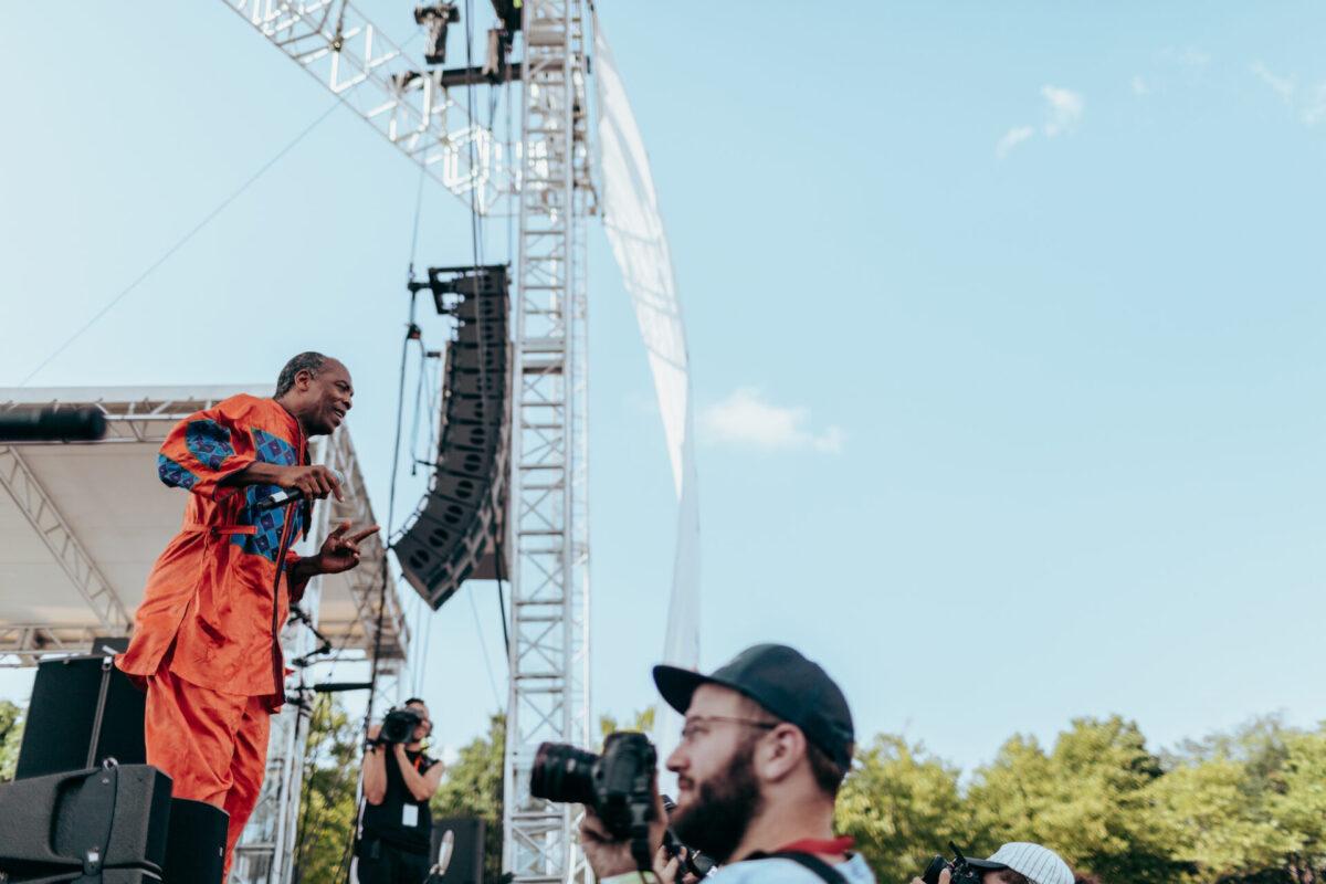 Much like the band’s opening song, “Evil People” featured a bombastic percussion section. The winding track instrumentally soared and transformed into a barebones spoken-word outro, Kuti arriving at the phrase “evil people can never know true joy,” before calling on the backing band to close out the song. On the following track, Kuti himself delivered a masterclass in circular breathing while performing a droning saxophone section of “Corruption Na Stealing.” Impressive feats of musicianship like these were sprinkled throughout the set, certainly a highlight of the day for the River Stage crowd.