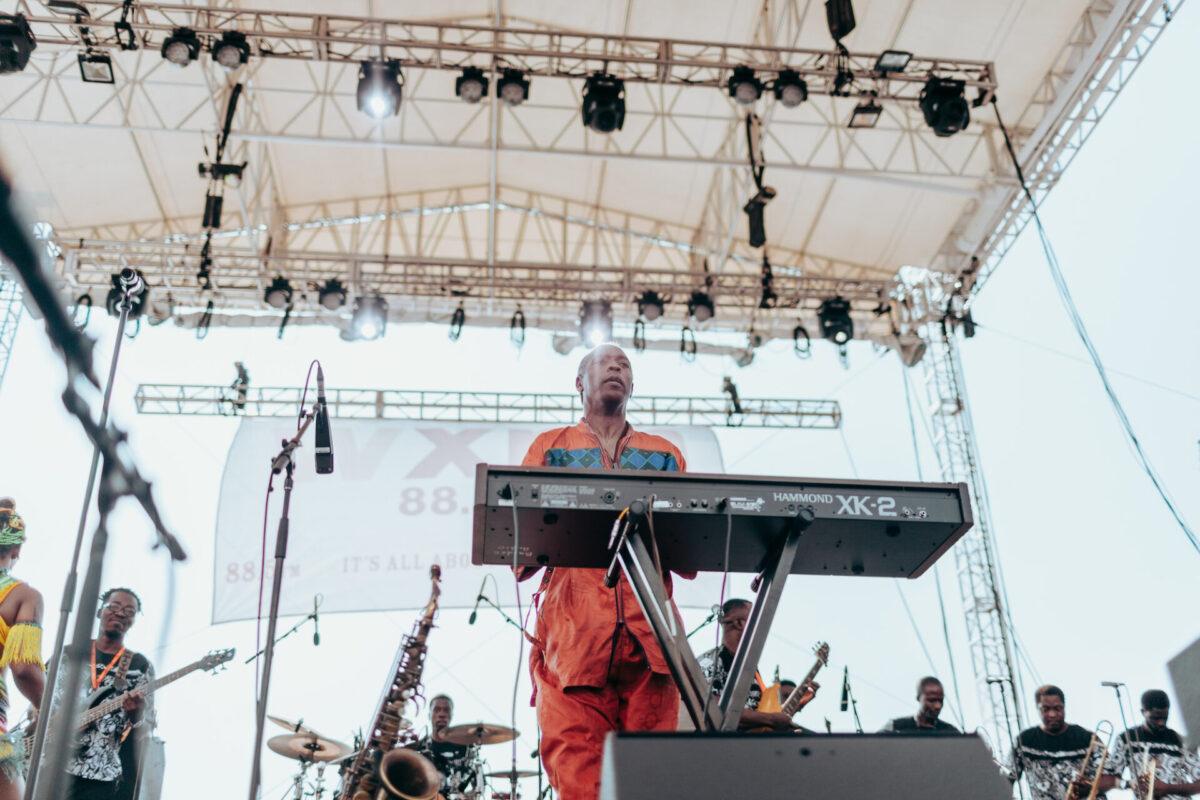 Thunderous baselines and massive percussion work flooded the River Stage at the beginning of Femi Kuti‘s set. Five members took to the stage to start, then grew to 12 before Kuti himself stepped up to helm the Hammond keyboard, joining in on the tremendous instrumental intro.