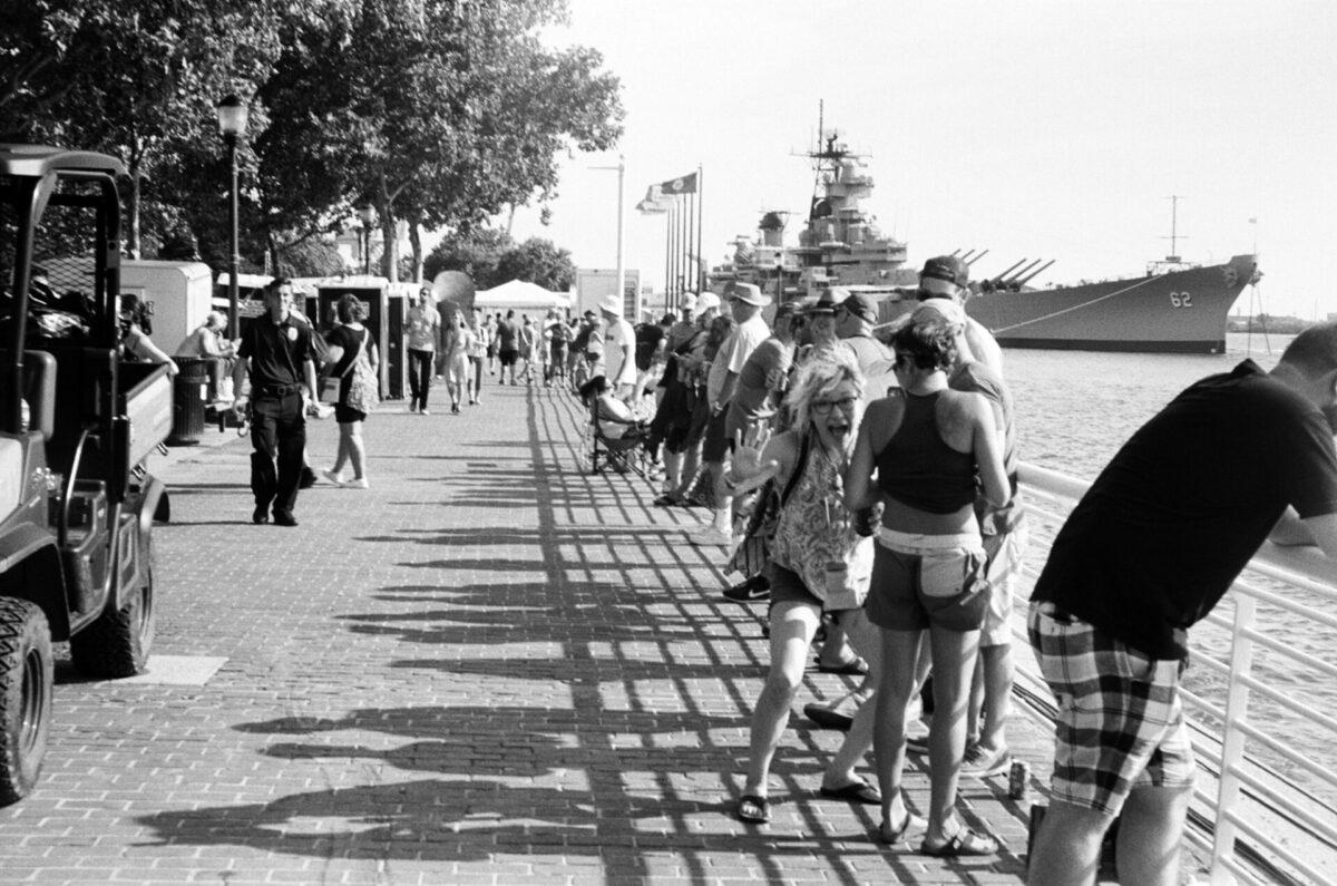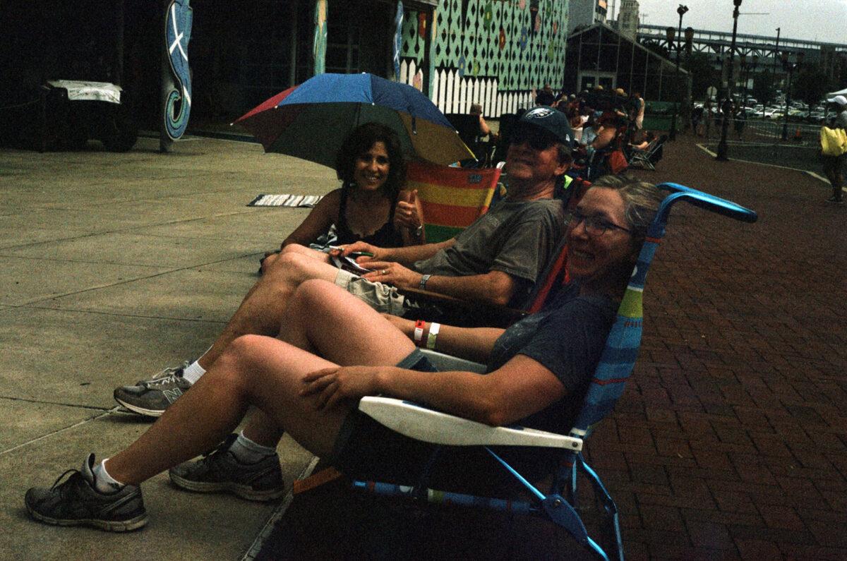 Love this image for so many reasons; the XPNFest-er making the gotcha pose, the afternoon sun casting long shadows on the promenade, and the way those shadows mirror F____r J__n M___y’s favorite battleship.