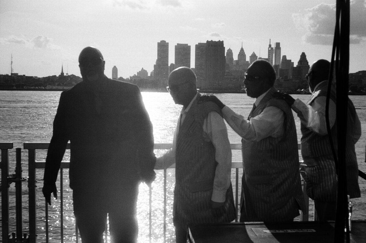 The Blind Boys of Alabama are led onstage for their Sunday evening performance as the sun sets over the Delaware River.