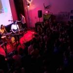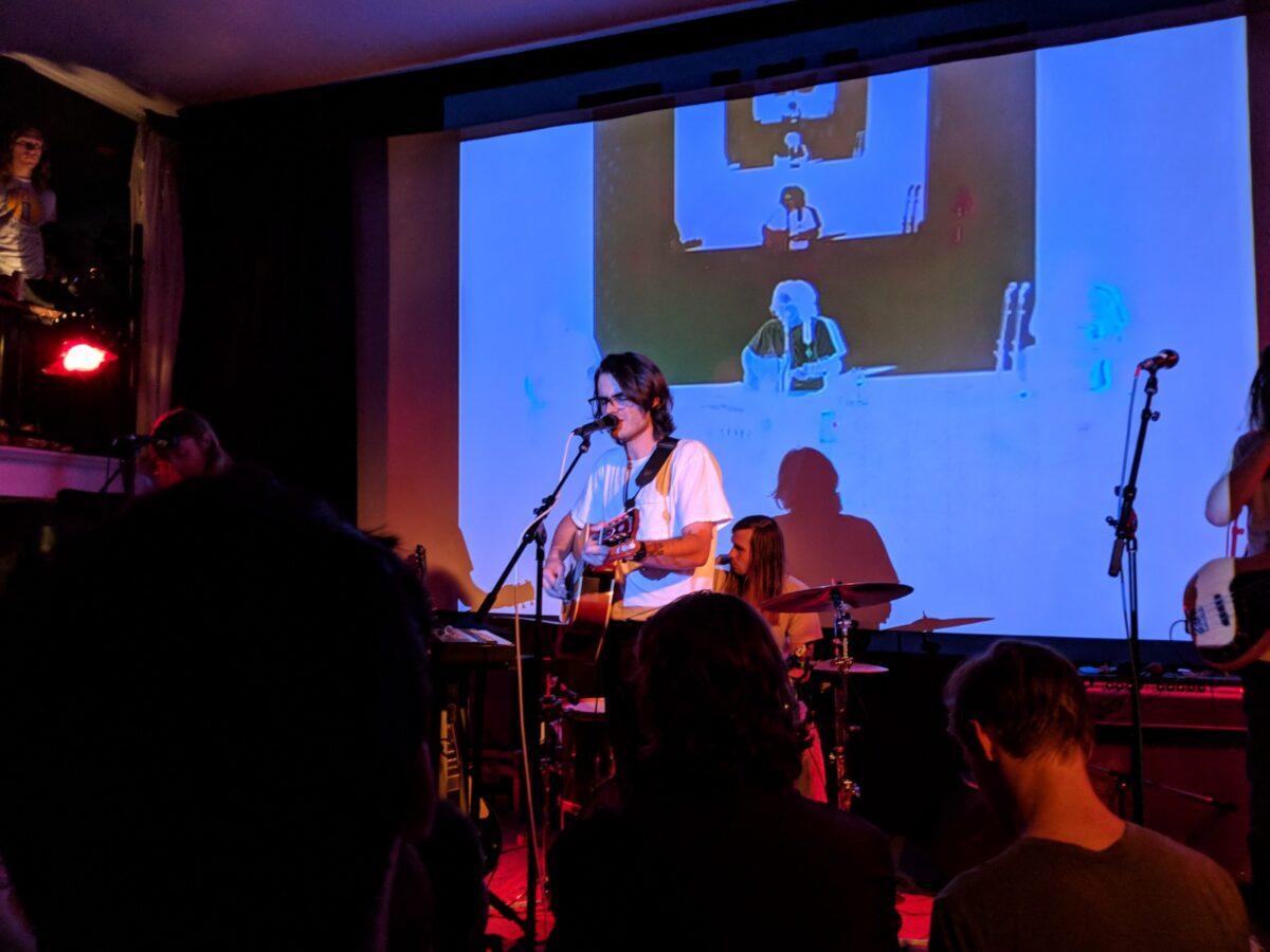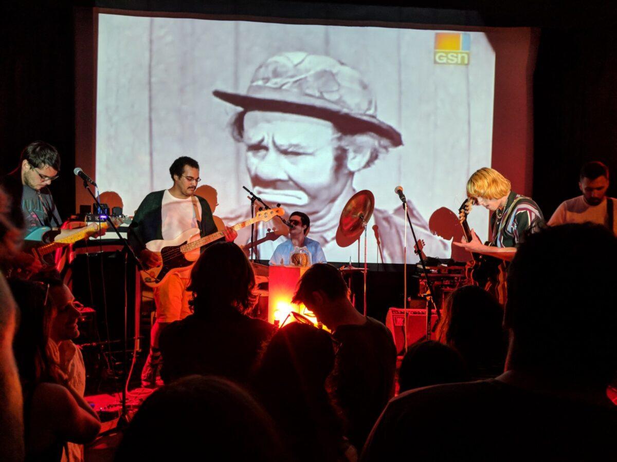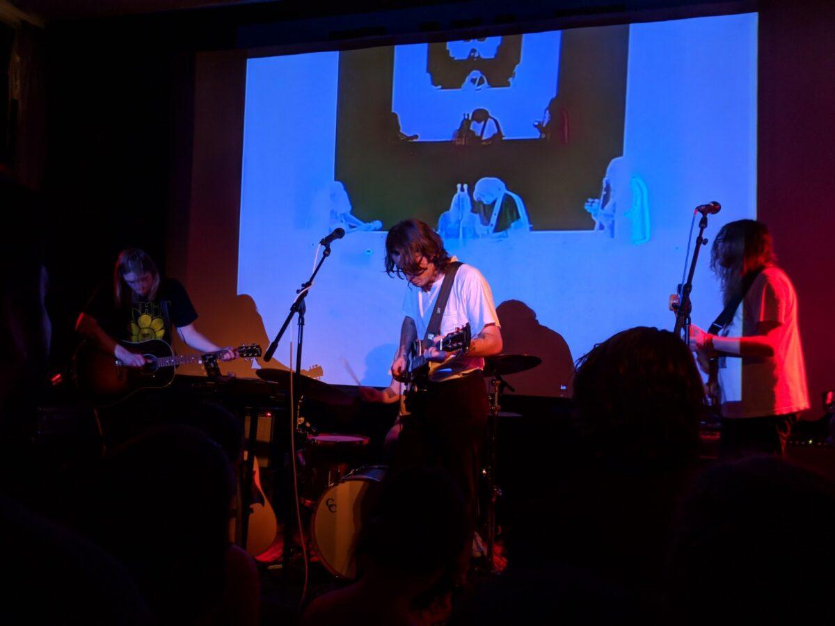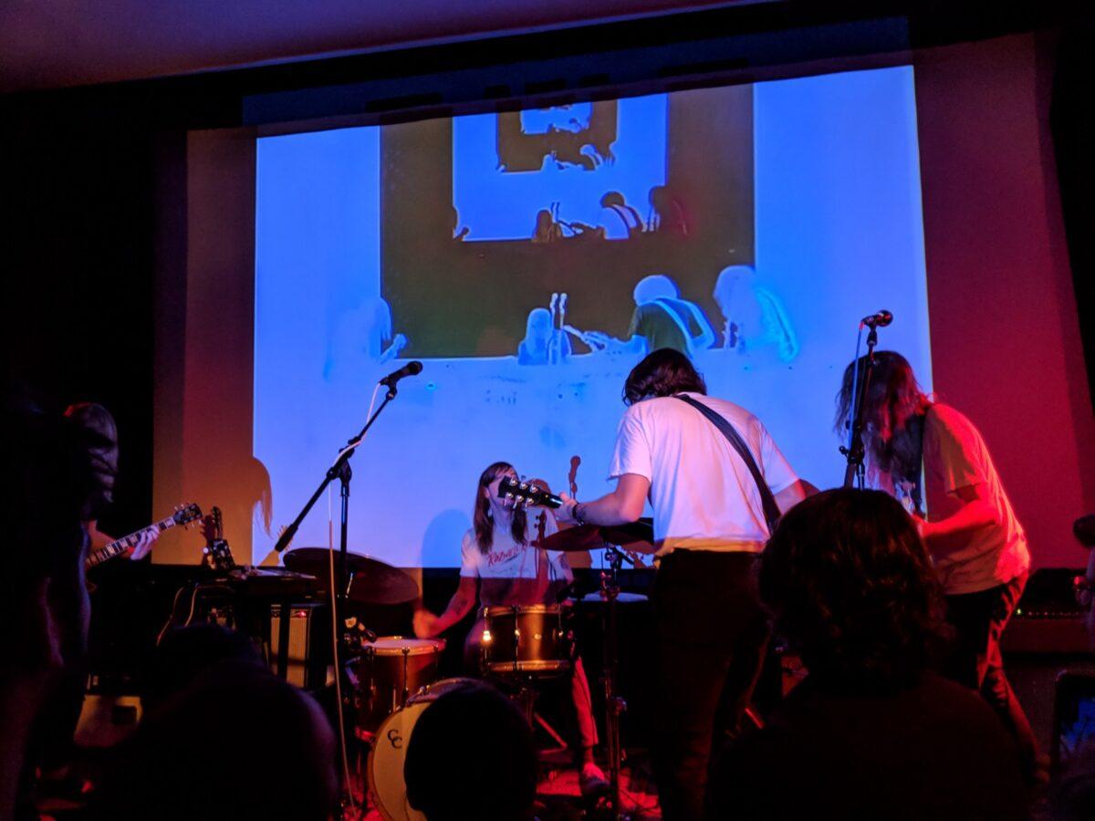 Queen Jesus kicked off the set with their dank, muggy, verging-on-shoegaze songs led by frontman/drummer Pat Brier along with various members of Three Man Cannon, Cherry, and Sun Organ. Their five-person group create hazy, ethereal rock that’s as disorienting as a night without AC in the summer, with visuals of old Game Show Network clips featuring a particularly tragic clown projected behind them, inducing a creepy, unsettling effect.