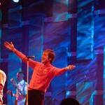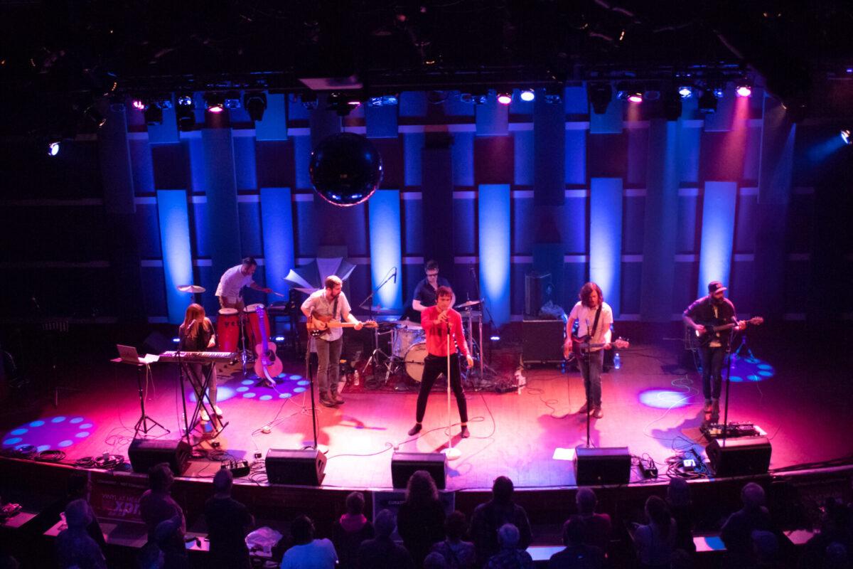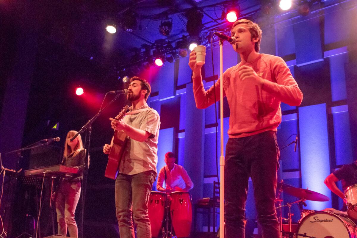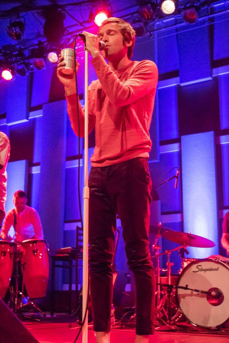 There’s nothing like a noontime dance party to really wake you up. Philly native Derek Krzywicki is the eccentric frontman behind Secret American, a band with a self-described “East Coast heart” and “West Coast vibe,” and for today’s Free at Noon he came prepared with a six-piece backing band, quirky choreography, and plenty of upbeat energy to accompany his sunny pop songs.