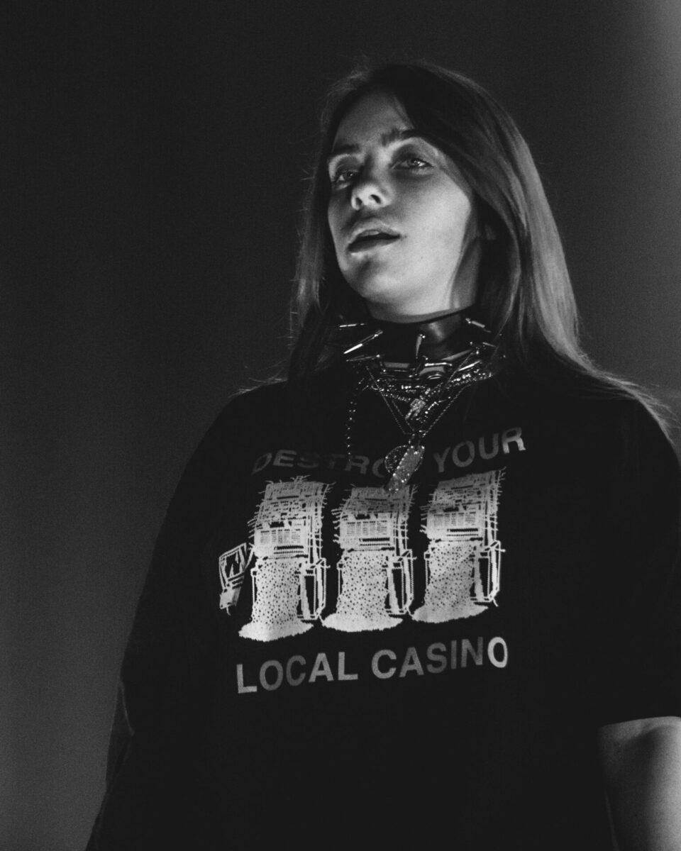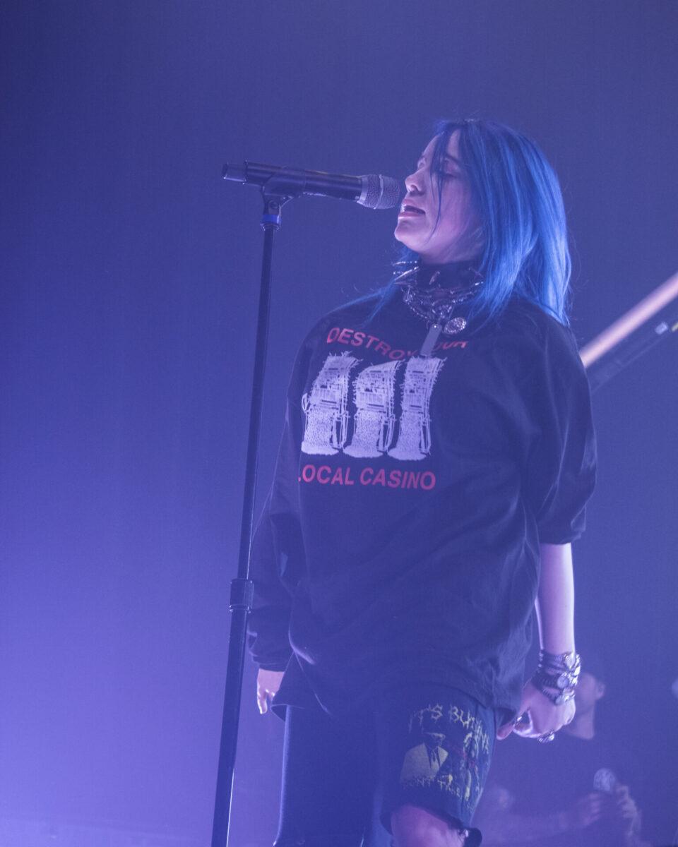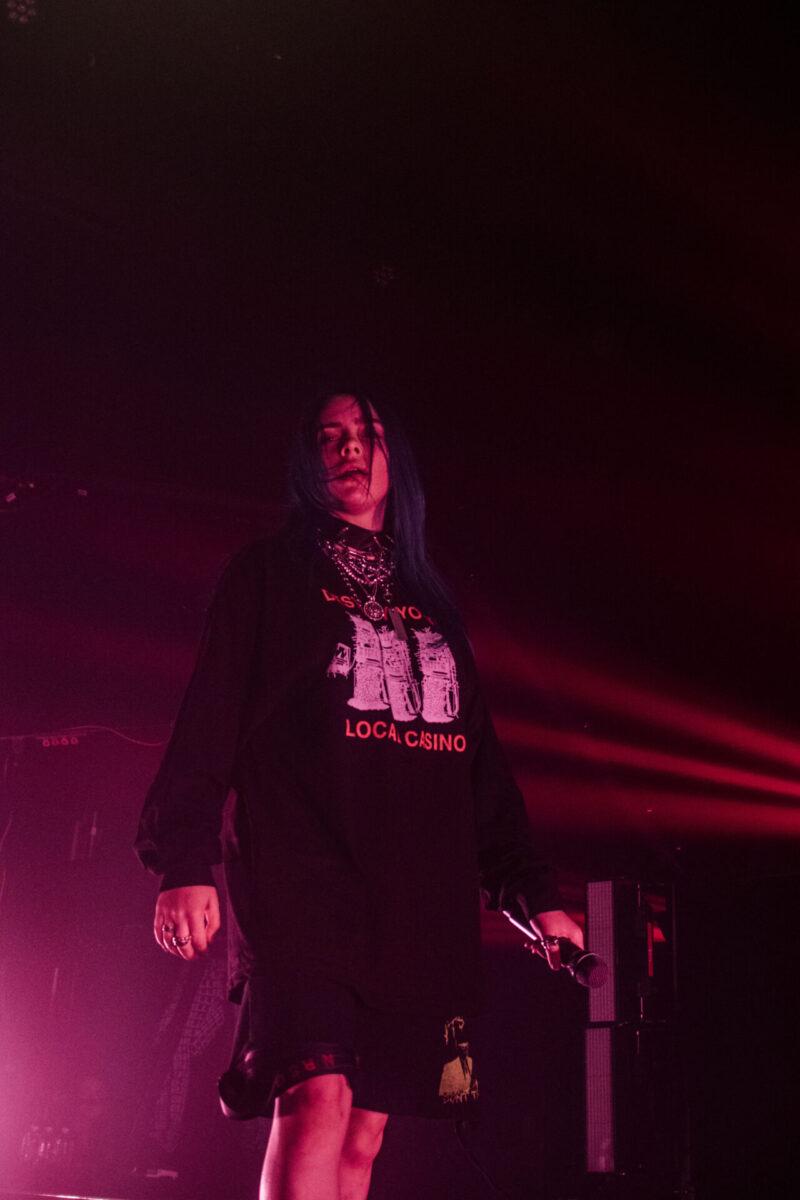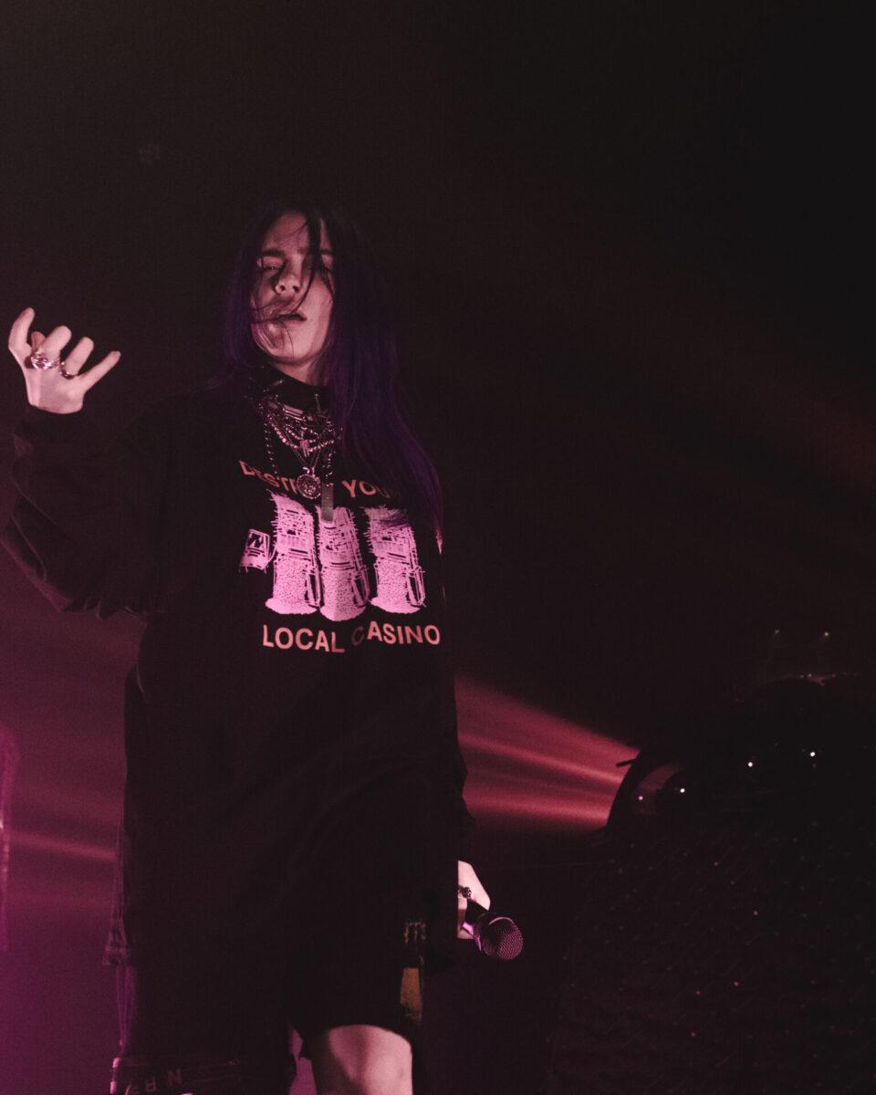 After Major’s set, the audience grew increasingly antsy by the minute as they chanted “Billie” about three separate times, which appeared to persuade Eilish to emerge from the shadows a little ahead of schedule. As the stage fogged up, you heard the deafening screams of every person in the pitch black room. A blinding light show began with streaks of blue, white, and purple beams circling the venue, then came to an immediate halt and changed to an eerie red as the introduction to the notorious FX series American Horror Story playing in the background. A white beam shot out from the stage, and behind it was Eilish, back towards the audience and sporting a thick silver chain around her neck, as well as a “Destroy Your Local Casino” hoodie (take that, Sugarhouse).