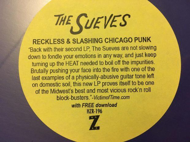 The Sueves – R.I.P. Clearance Event: Just look at all that text. Chicago’s Hozac Records, takes it old school in its way of describing this barn burner of an album by The Sueves. Funny thing, the sticker doesn’t even mention the album’s title. Instead, you’re left with nothing but forceful wording for this three-piece’s searing guitar playing, which is right up front with the singer’s raspy howl on “Dead People’s Cars,” and “Never Been to the Beach.”