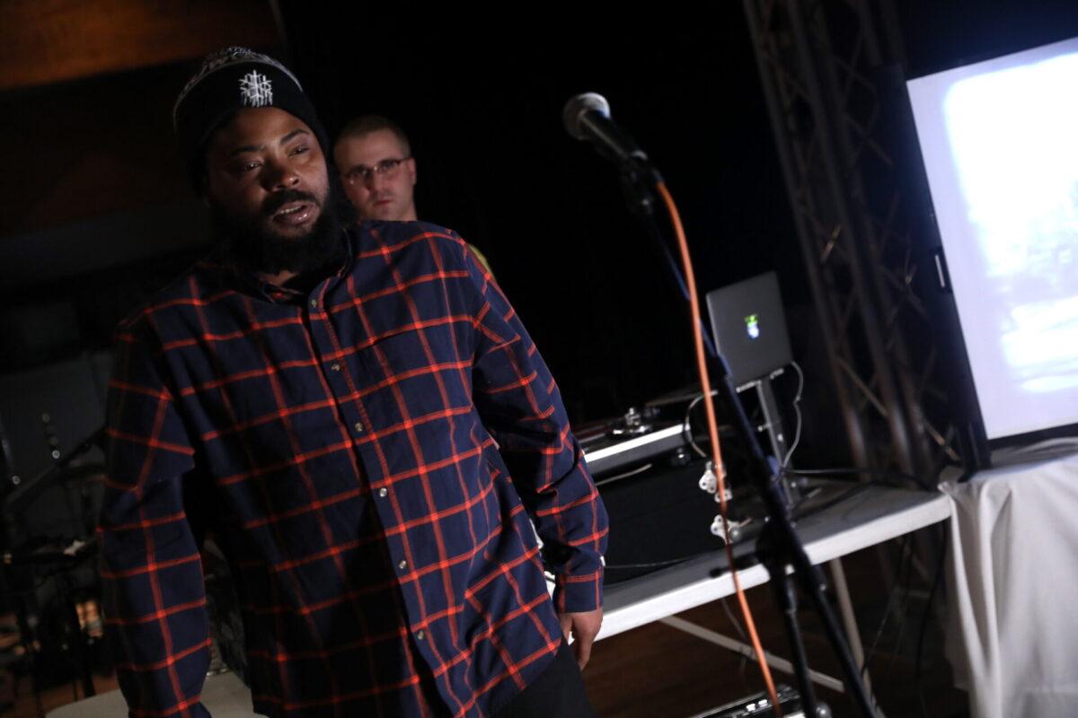 Unlike last time, where the live band provided a new and unexpected energy, Reef the Lost Cauze’s return to The Key Studio Sessions shows him in his rawest form, feeding on the beats as we hear them on the album, and responding to Caliph-NOW’s visual show — a constantly moving collage of music video clips, distressed and abstract animation, and family photos.