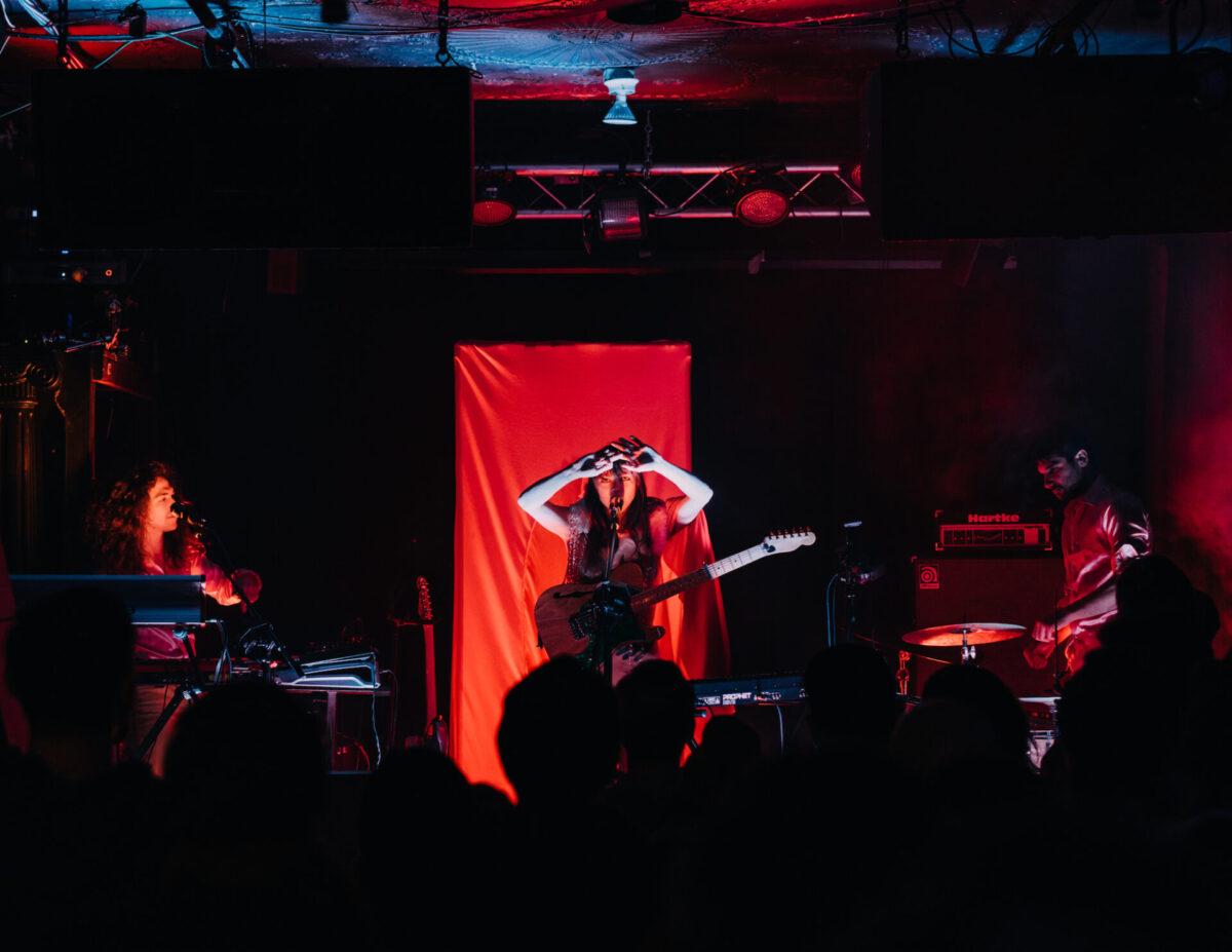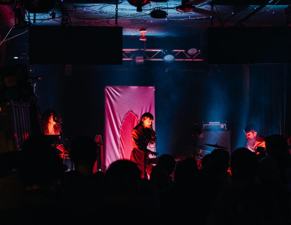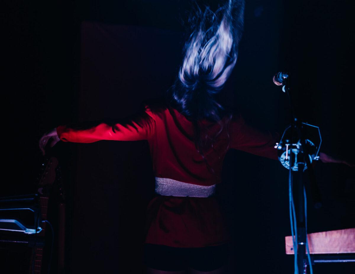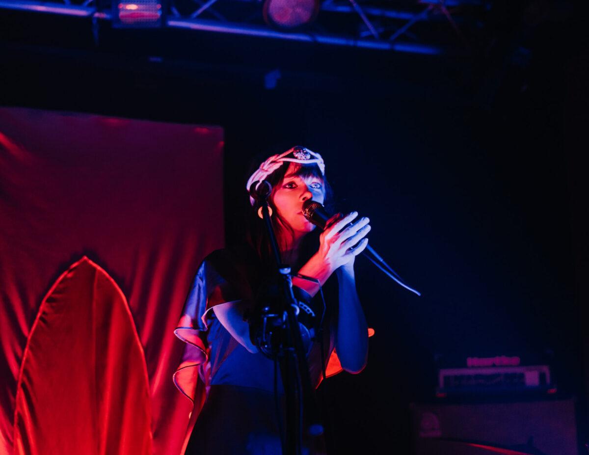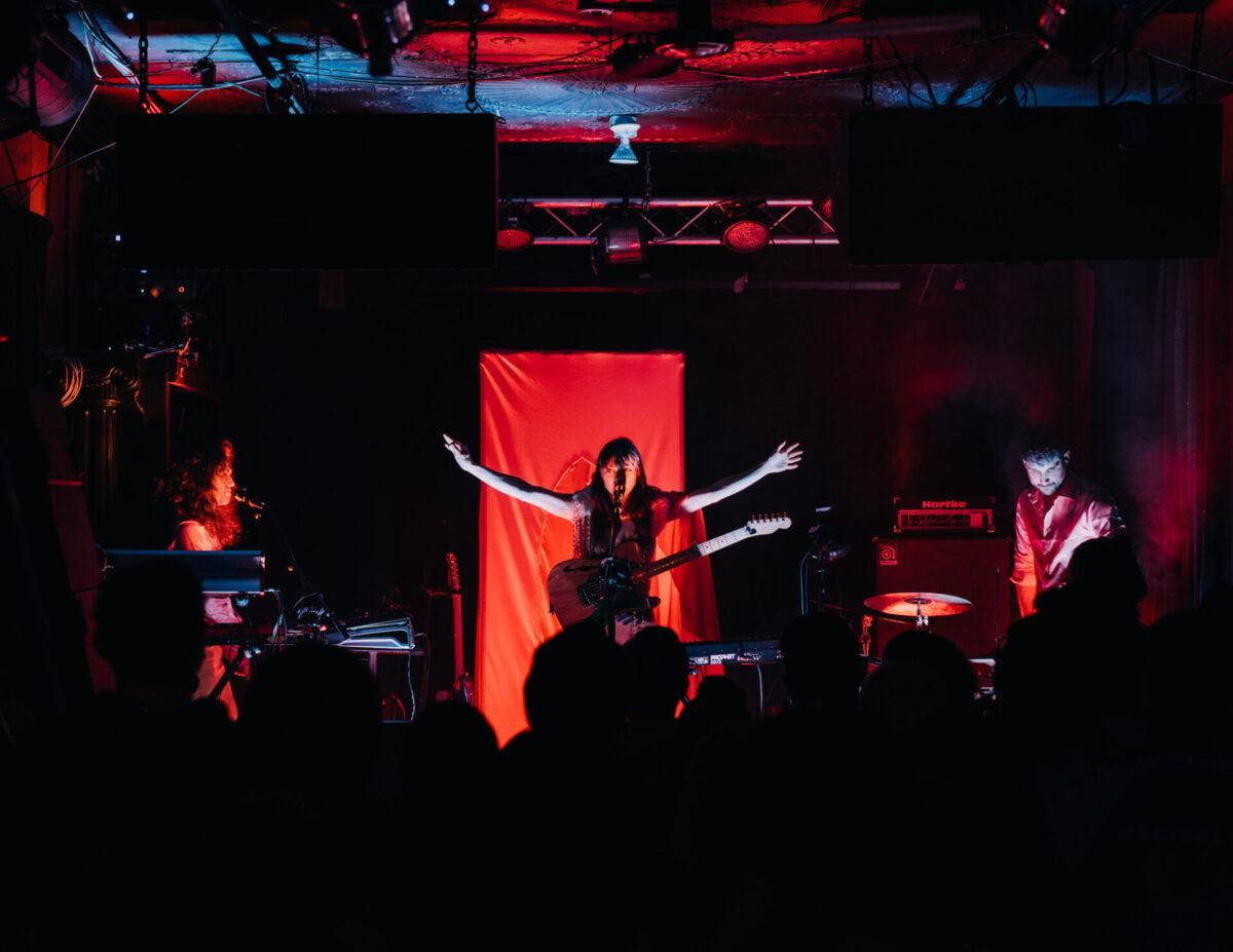 Arc Iris started their show with Adams’ shadow being seen through a large pink fabric box. When she fully emerged, we could see she was wearing a sparkling headpiece and pink jumpsuit. Meanwhile, keys player Zach Tenorio Miller and drummer Ray Belli wore matching pink satin shirts. This is a group that embraces theatricality; Arc Iris had choreographed dance moves, purposeful light changes, and Adams had two outfit changes — impressive considering the tiny space of MilkBoy’s stage! It is hard to identify the groups genre but, their new label described it as “pop-prog” so I’m going with that. The set focused on Arc Iris’ new album Icon of Ego, and it is deserving of your attention.