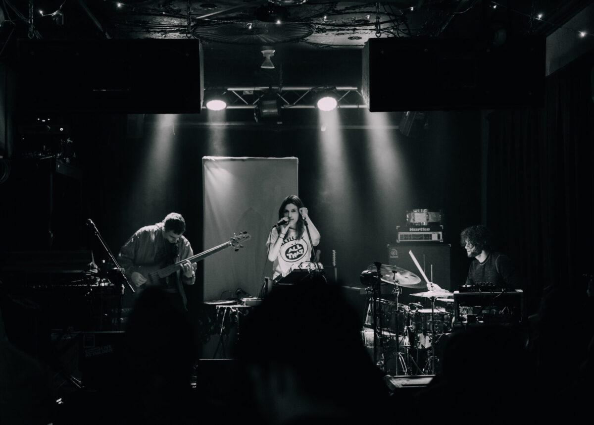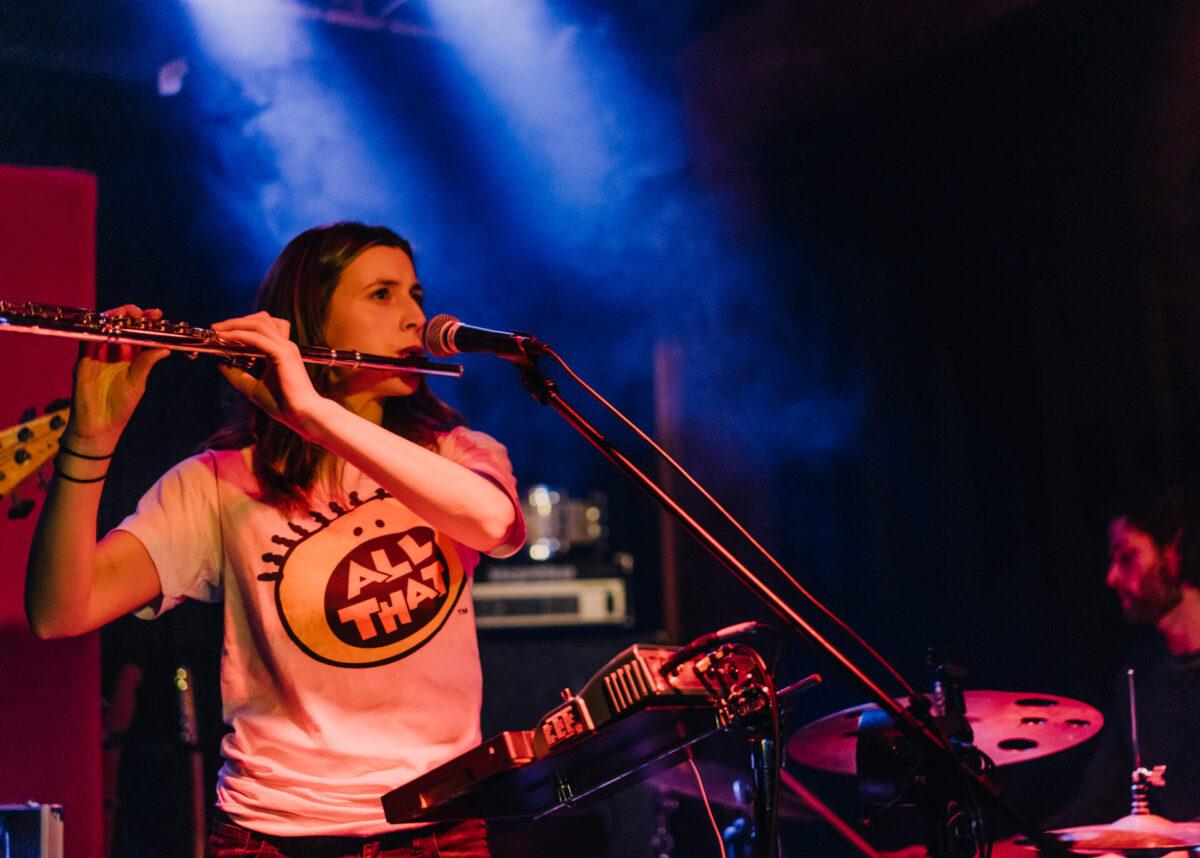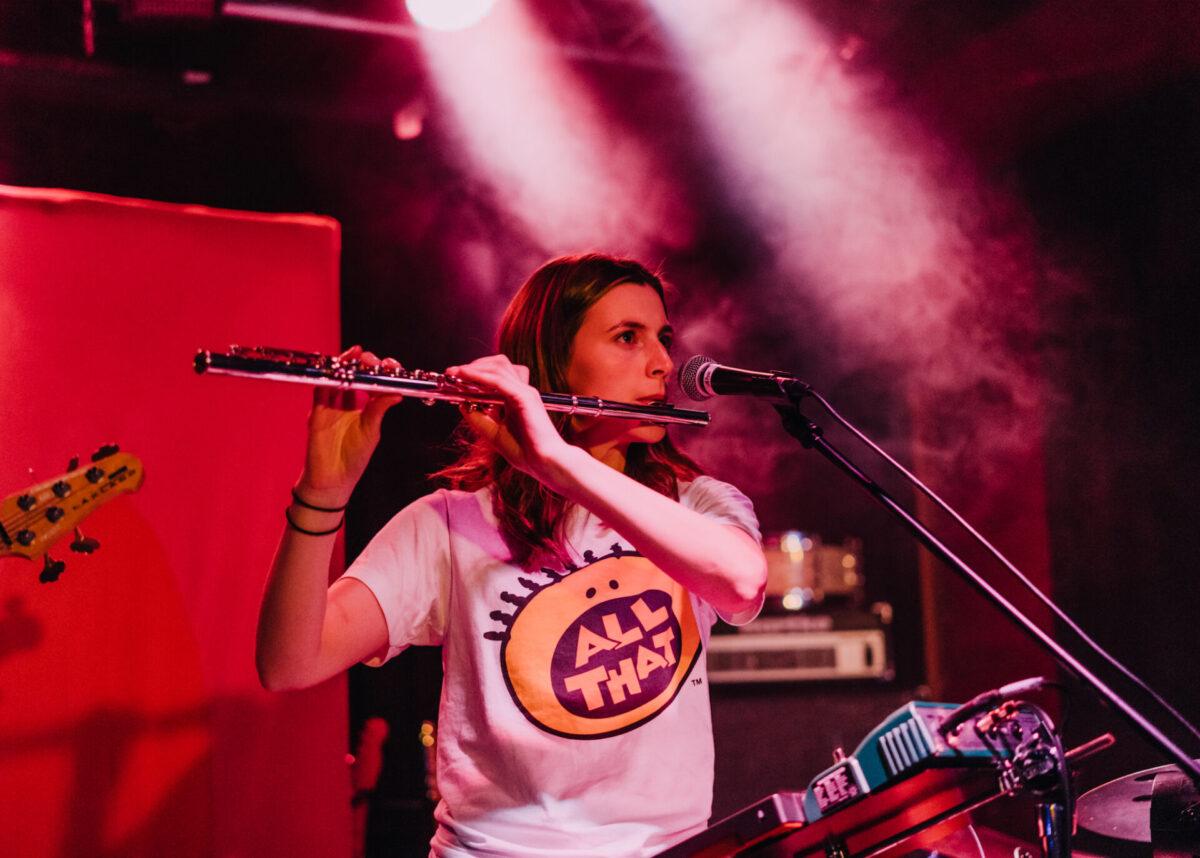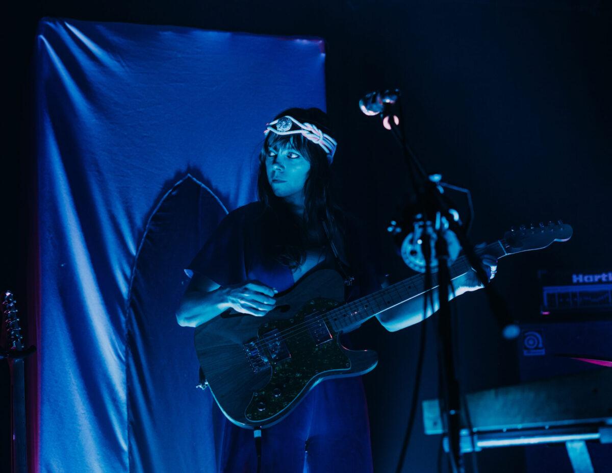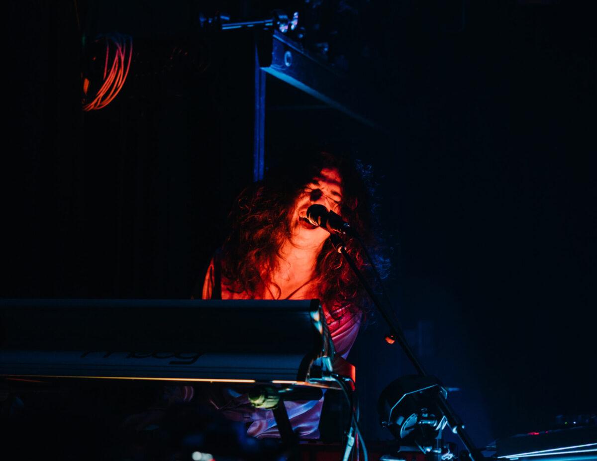 Arc Iris started their show with Adams’ shadow being seen through a large pink fabric box. When she fully emerged, we could see she was wearing a sparkling headpiece and pink jumpsuit. Meanwhile, keys player Zach Tenorio Miller and drummer Ray Belli wore matching pink satin shirts. This is a group that embraces theatricality; Arc Iris had choreographed dance moves, purposeful light changes, and Adams had two outfit changes — impressive considering the tiny space of MilkBoy’s stage! It is hard to identify the groups genre but, their new label described it as “pop-prog” so I’m going with that. The set focused on Arc Iris’ new album Icon of Ego, and it is deserving of your attention.