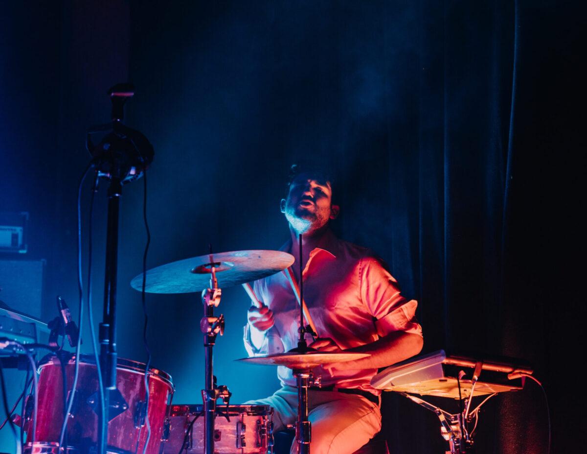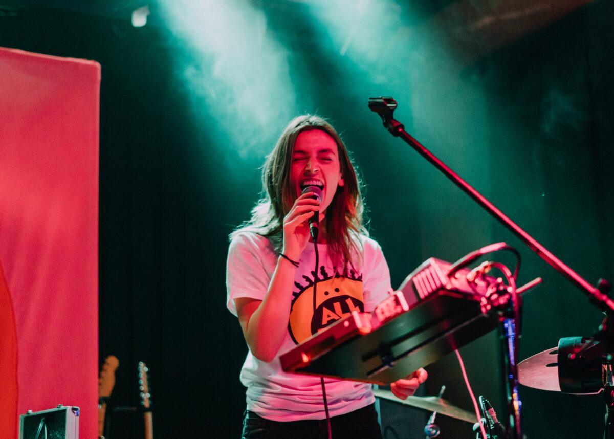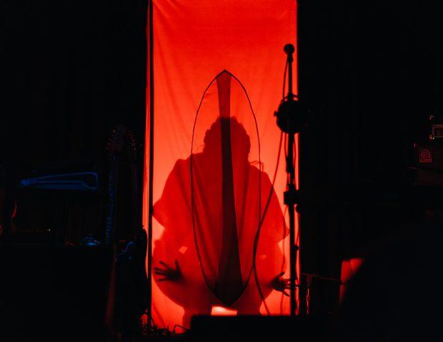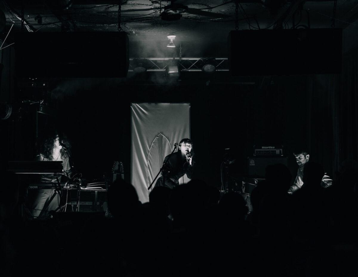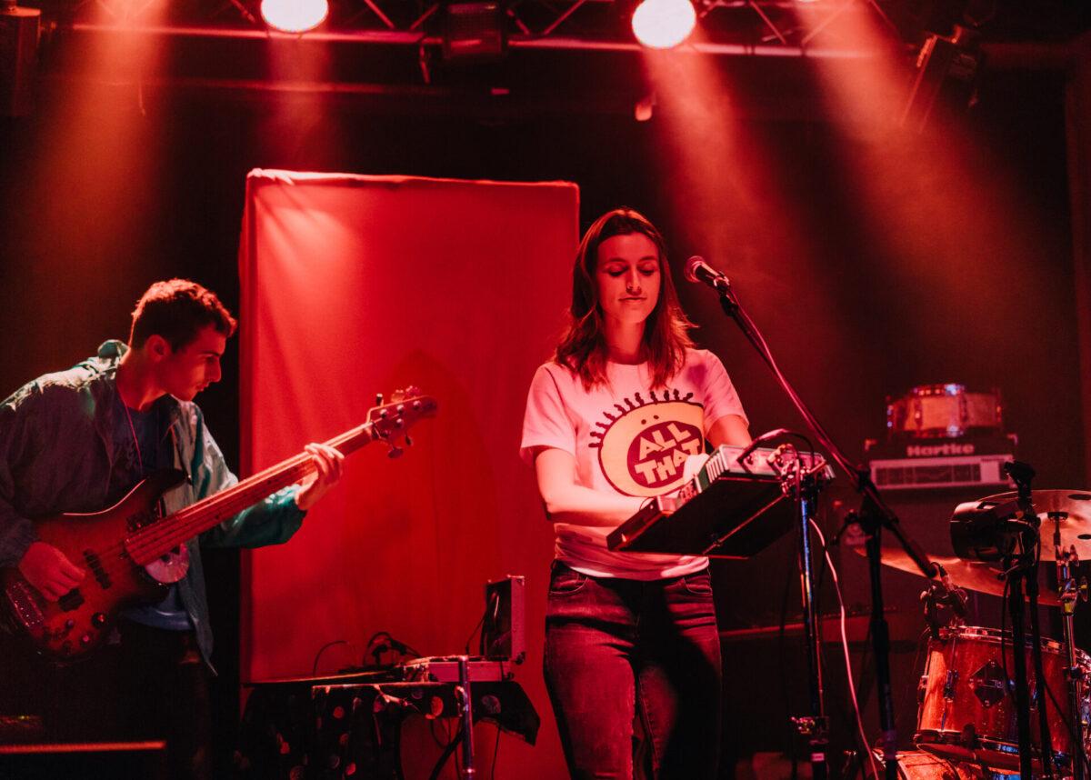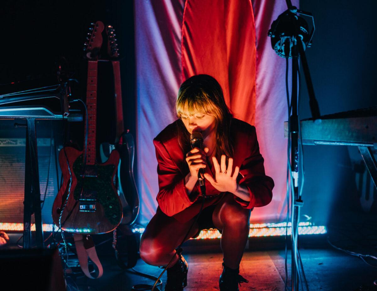 Arc Iris started their show with Adams’ shadow being seen through a large pink fabric box. When she fully emerged, we could see she was wearing a sparkling headpiece and pink jumpsuit. Meanwhile, keys player Zach Tenorio Miller and drummer Ray Belli wore matching pink satin shirts. This is a group that embraces theatricality; Arc Iris had choreographed dance moves, purposeful light changes, and Adams had two outfit changes — impressive considering the tiny space of MilkBoy’s stage! It is hard to identify the groups genre but, their new label described it as “pop-prog” so I’m going with that. The set focused on Arc Iris’ new album Icon of Ego, and it is deserving of your attention.