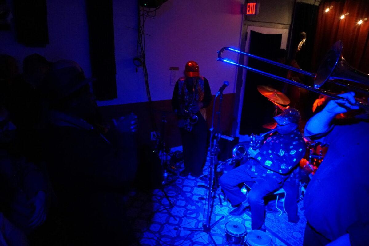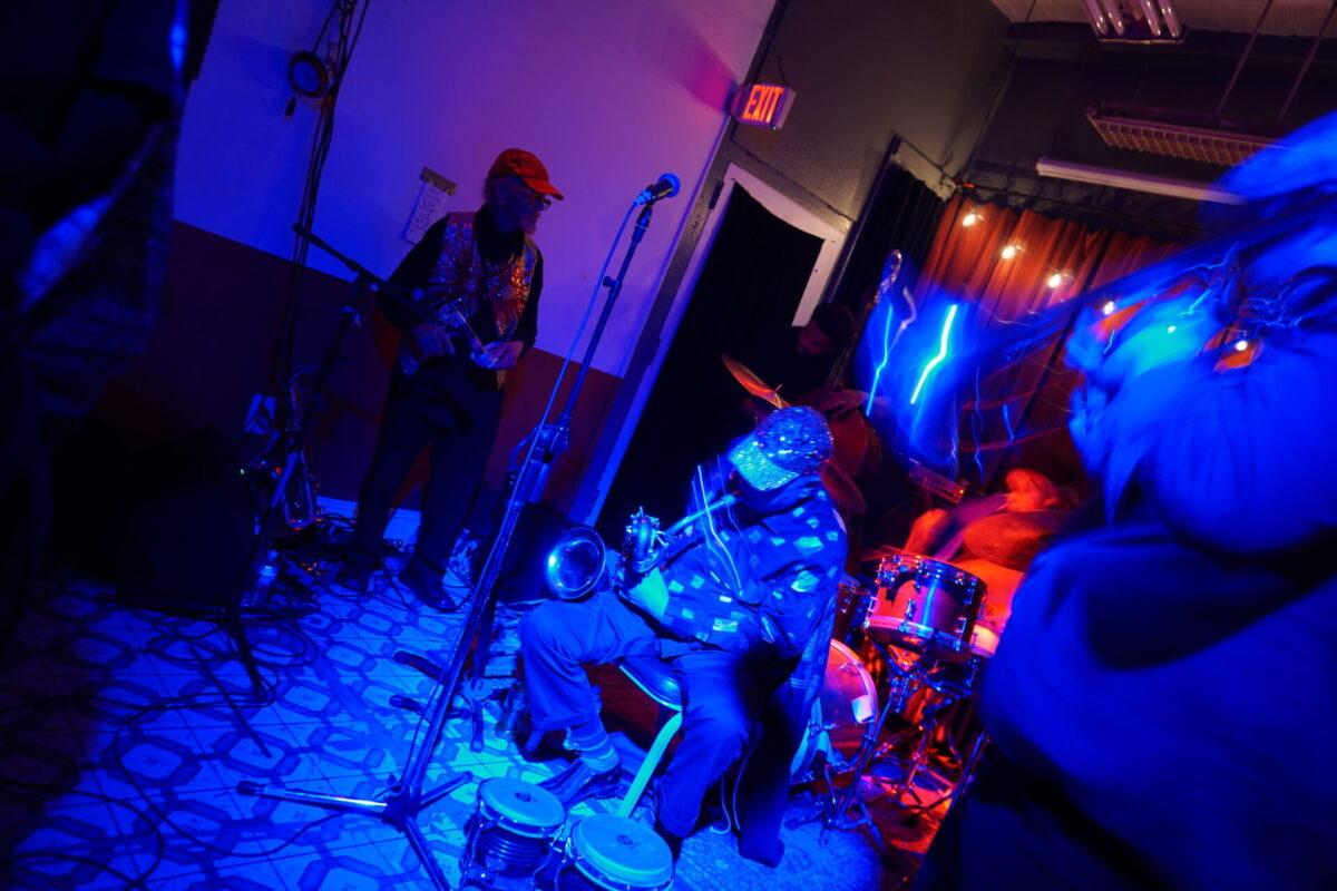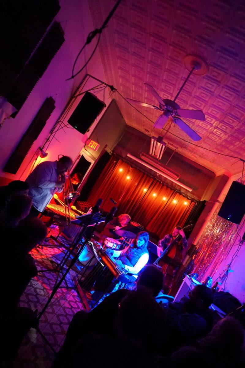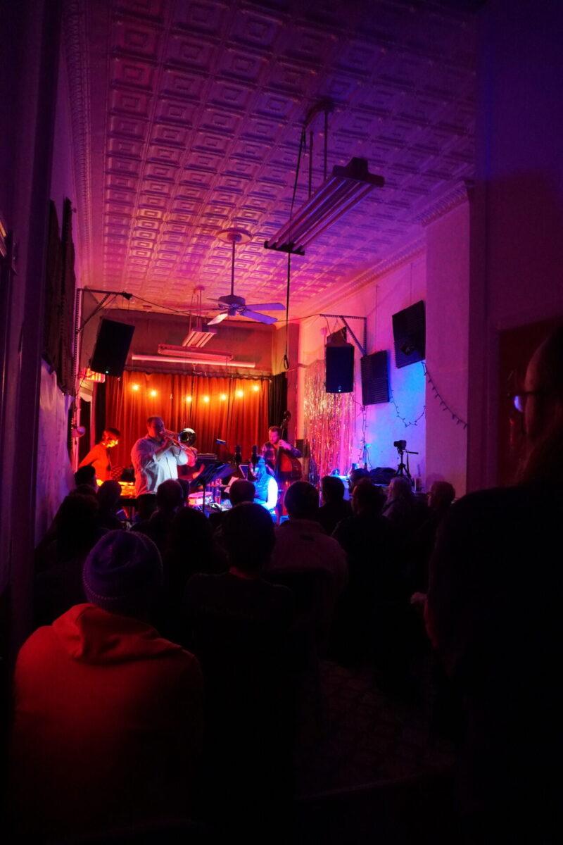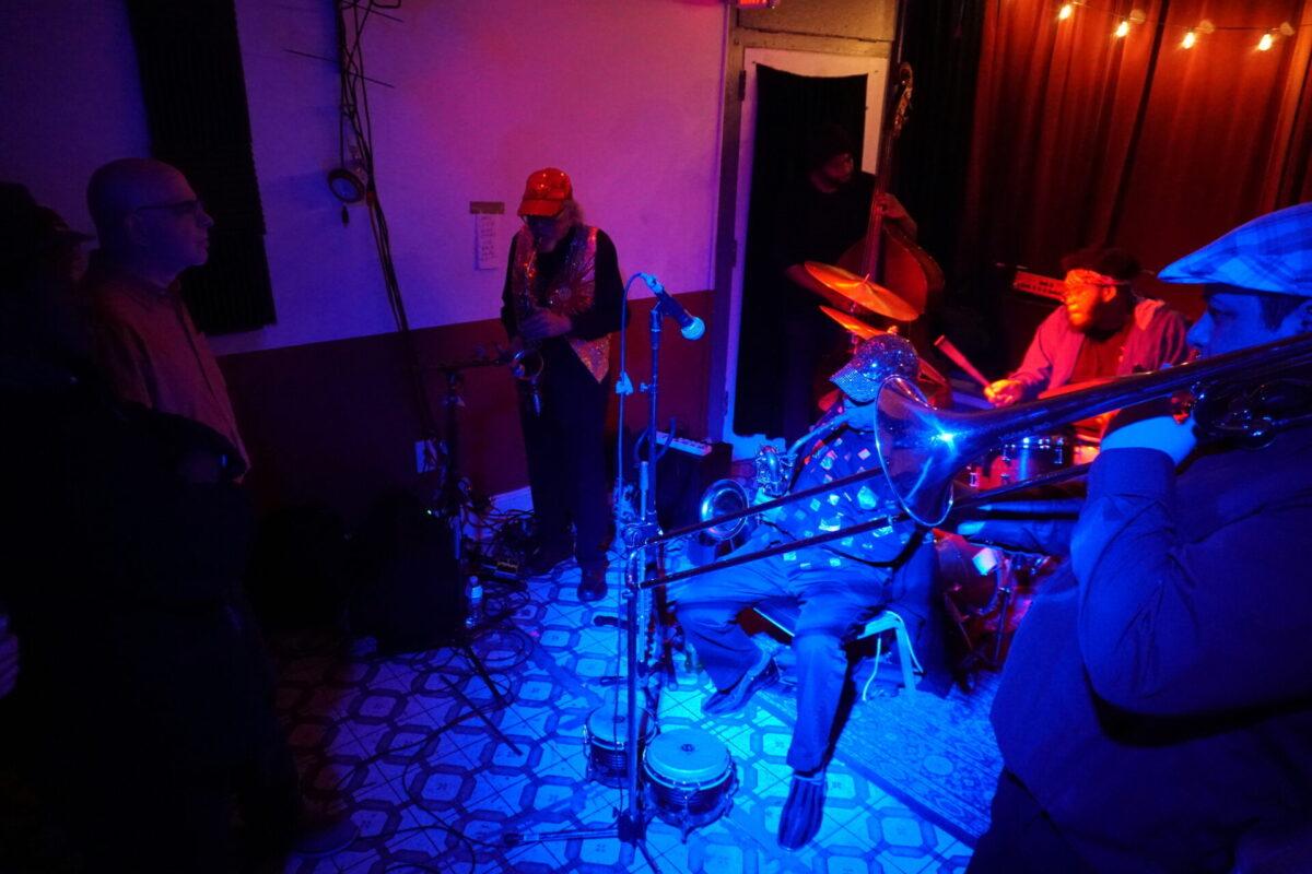 Under the wintry backdrop of 52nd Street’s gated storefronts, Chinese takeout spots, and fading neon lights, musicians as eclectic as pedal steel artist Susan Alcorn and legendary Arkestra bandleader Marshall Allen descended the steps (and then ascended them again — Mothership is basically a magically converted row home with just, like, the weirdest set of rickety stairs to enter) to sonically entrance us.