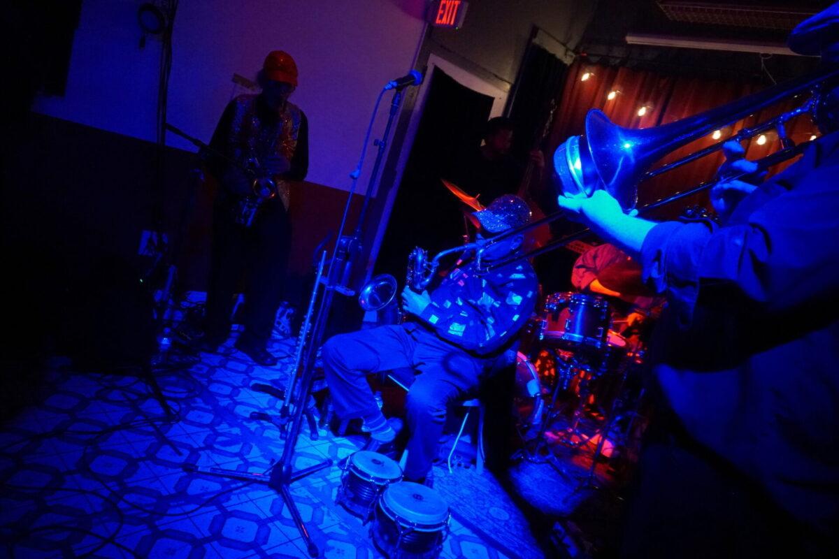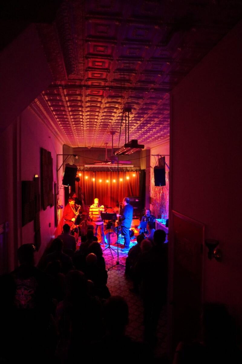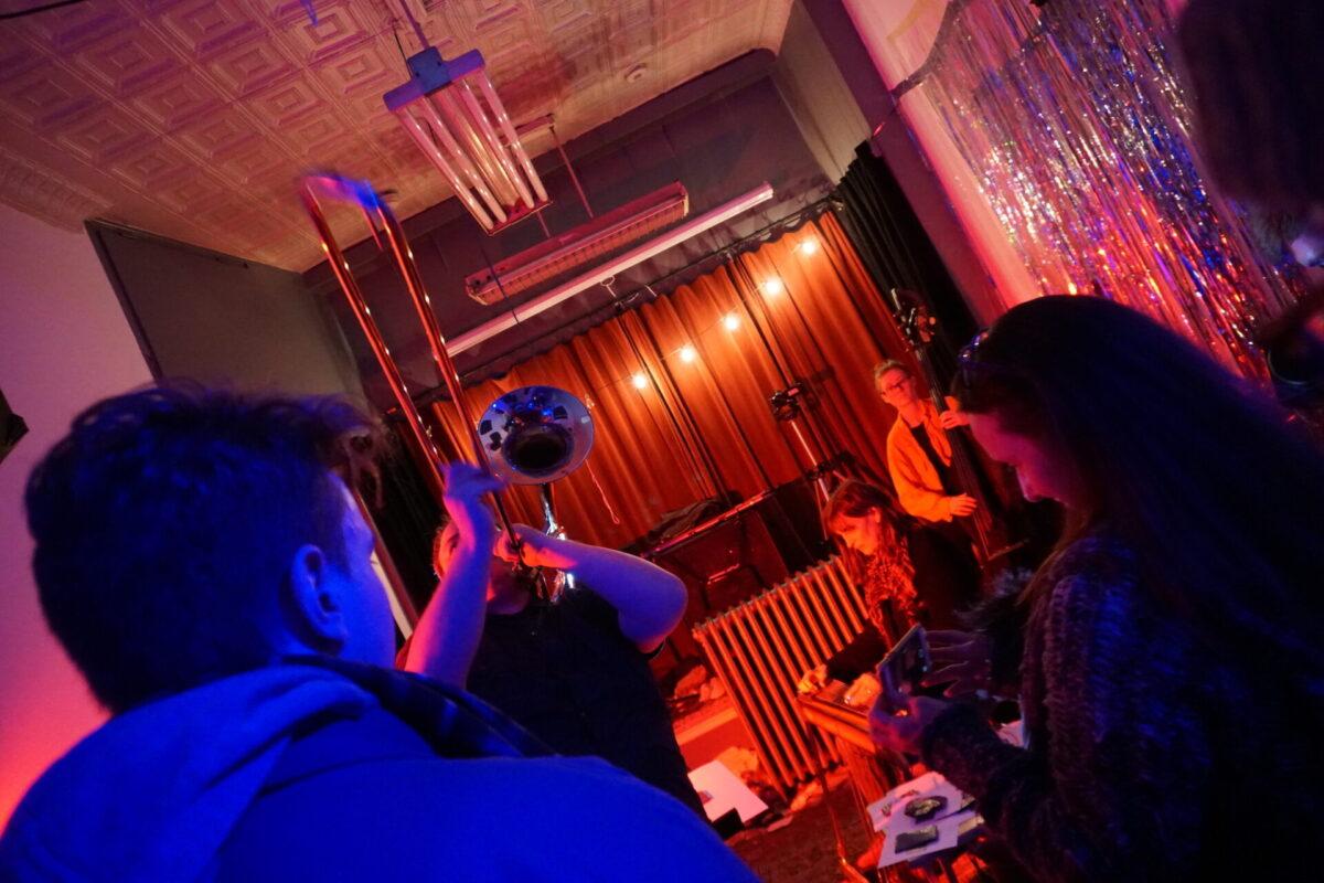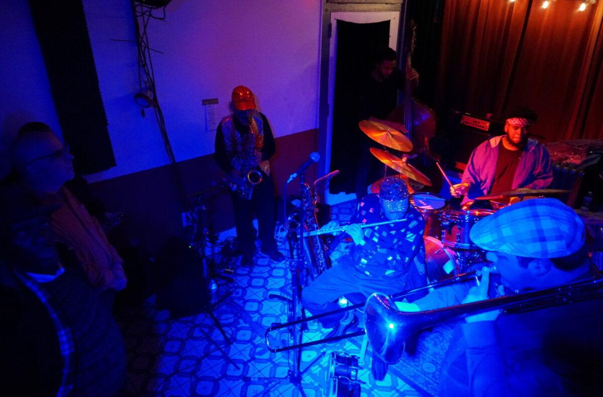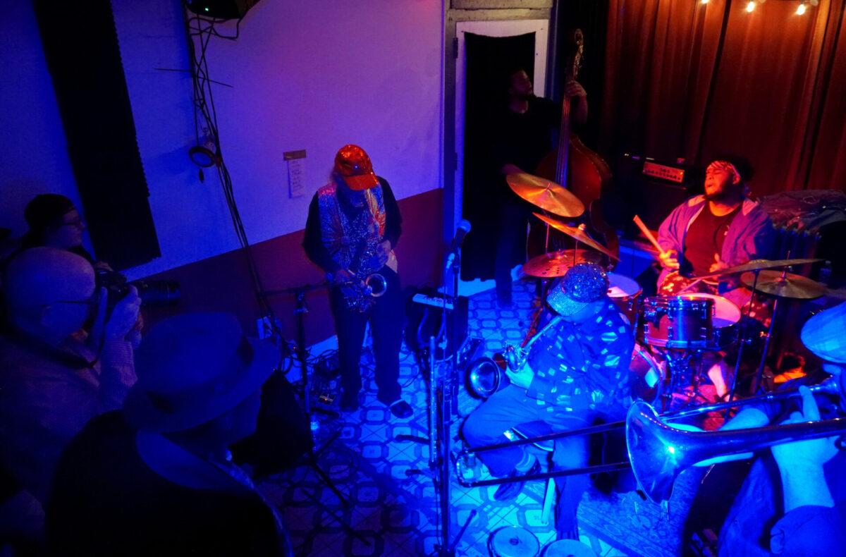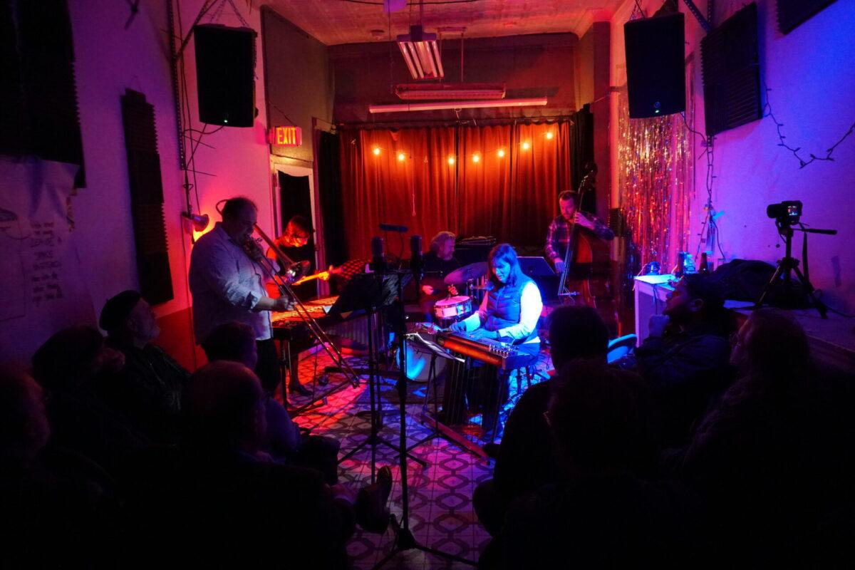 Under the wintry backdrop of 52nd Street’s gated storefronts, Chinese takeout spots, and fading neon lights, musicians as eclectic as pedal steel artist Susan Alcorn and legendary Arkestra bandleader Marshall Allen descended the steps (and then ascended them again — Mothership is basically a magically converted row home with just, like, the weirdest set of rickety stairs to enter) to sonically entrance us.