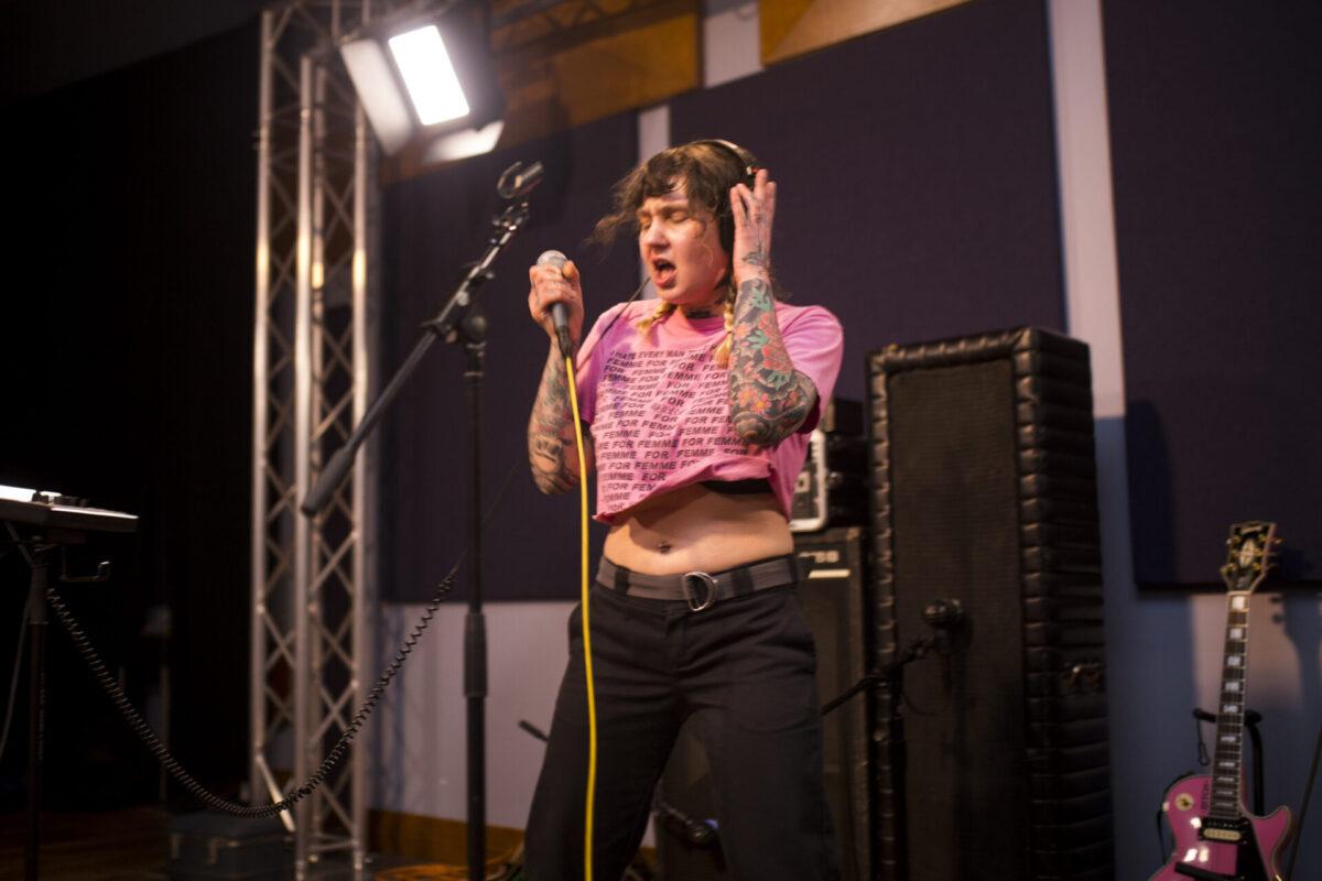 Not that it was an obstacle. Frontwoman Itarya Rosenberg stood quietly holding the mic, a brutal guitar riff began looping out of the speakers, and it was like a switch flipped on — bandmates Mike McGinnis on guitar, Jon DeHart on bass, and Dan Smith on drums launched into a crushing jam, Rosenberg crouched to the floor, and howled. I stood to the side, next to Great Weights’ Meri Haines, and we both watched drop-jawed and awestruck. Twenty minutes of poppy hooks, dissonant freakouts, and general punk catharsis later, we looked at one another all like “What the hell was that?”