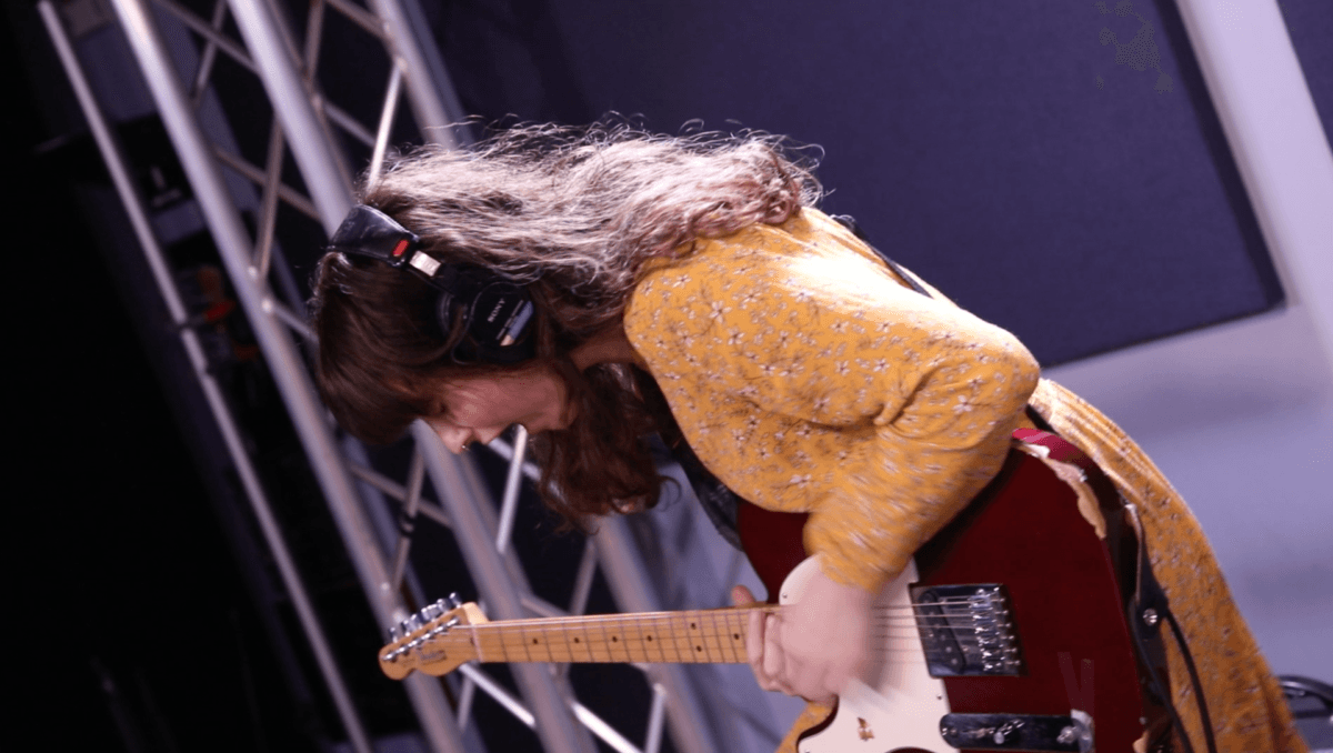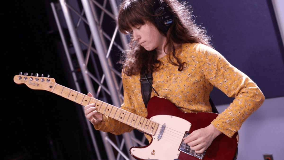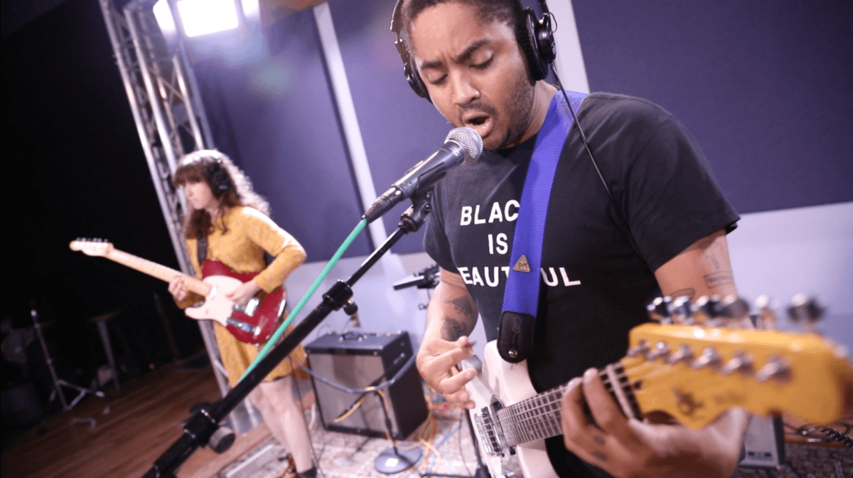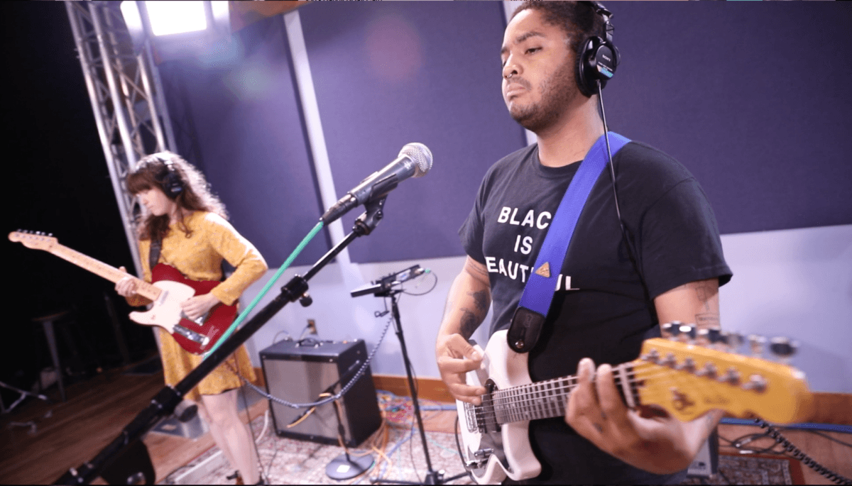 Thundering clouds of Haines’ guitar cry from your right headphone, while Johnson’s unsteadily teetering upper register guitar licks answer with a shriek in your left. As Johnson pummels complex chord progressions on the one side, Haines is leaning into a rapidly strummed noise solo, scraping strings and hammering the neck of her guitar. Watch that in action on this performance of “Sorrow” from the session.