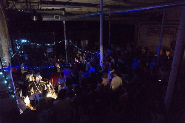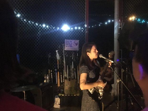 A few minutes after the doors opened at Everybody Hits, the sun was setting and the batting cages inside were still busy. Fans had already been trickling in; some sat at the picnic tables and some sat on the plywood floor, cross-legged underneath blue and turquoise string lights. After the cages closed, the atrium was almost pitch dark and the light from the bathroom sent oblique shadows up the walls. Blink-182 played from the PA as more fans arrived, and soon the room was full of hugs and laughter.