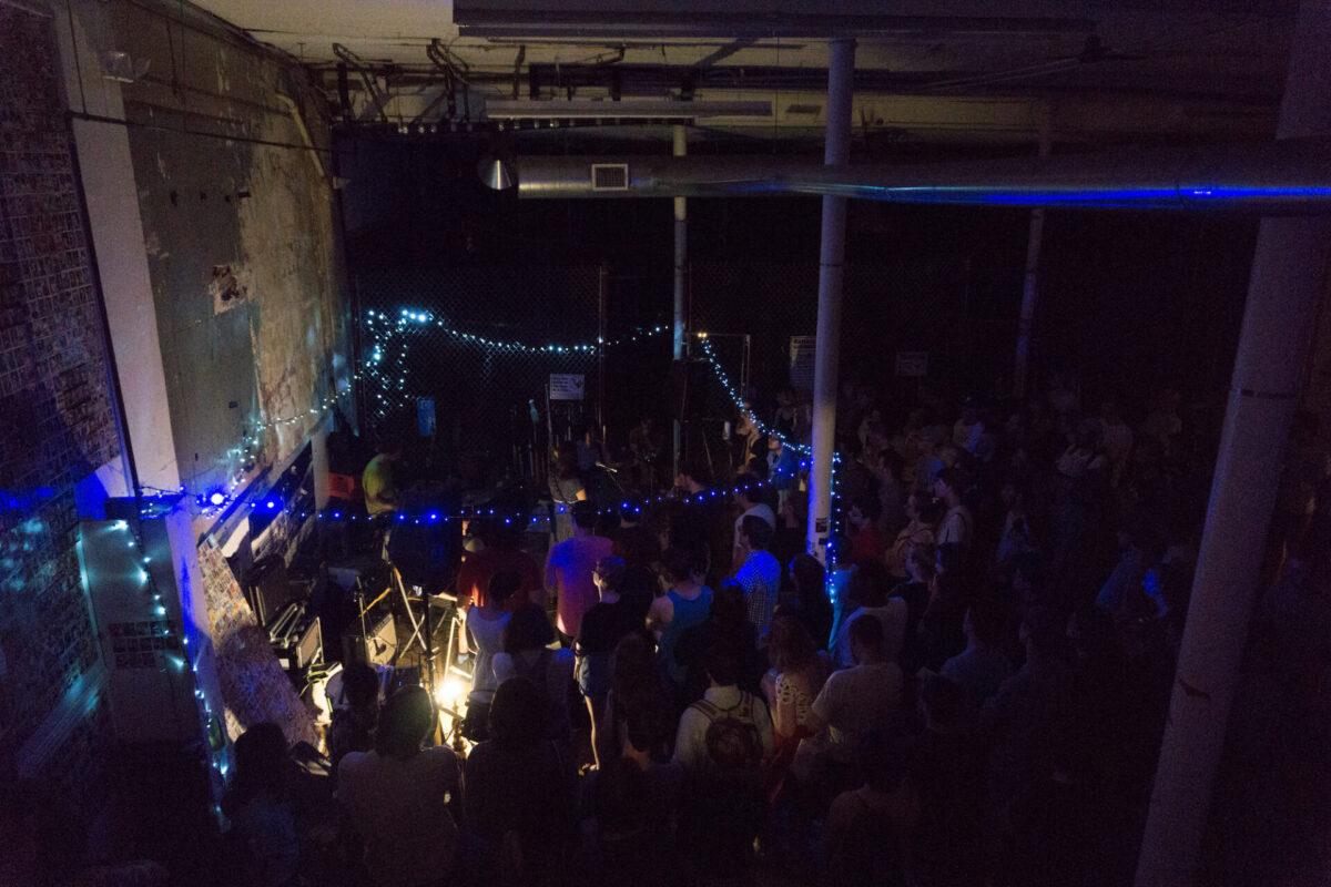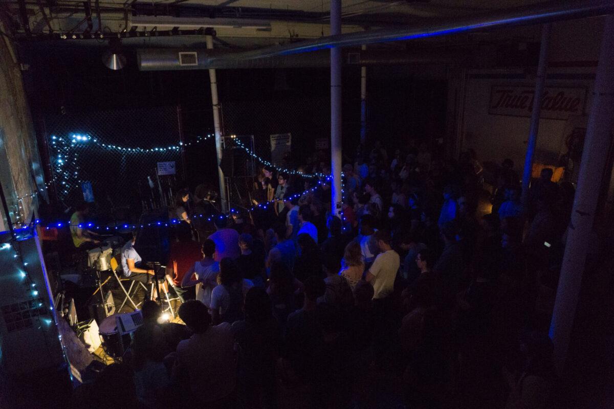 A few minutes after the doors opened at Everybody Hits, the sun was setting and the batting cages inside were still busy. Fans had already been trickling in; some sat at the picnic tables and some sat on the plywood floor, cross-legged underneath blue and turquoise string lights. After the cages closed, the atrium was almost pitch dark and the light from the bathroom sent oblique shadows up the walls. Blink-182 played from the PA as more fans arrived, and soon the room was full of hugs and laughter.