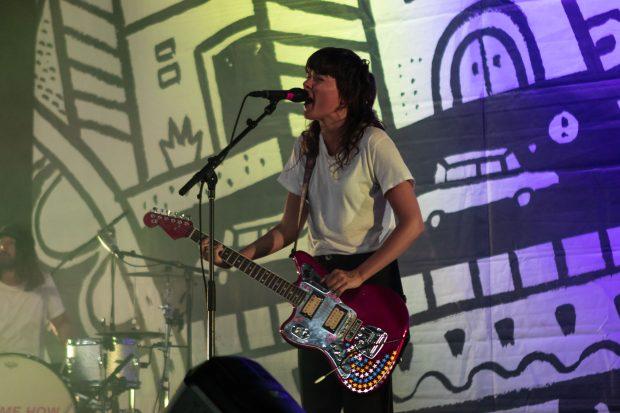 Barnett greeted everyone with a rousing “Well, good evening!” as the sun began to set and the crowd continued to grow. Her trio spread themselves far apart on the stage in front of a fabulous backdrop: a tall cloth screen displaying an urban sprawl in a black and white cartoon, flattened out like a cubist comic. Barnett let loose early with her guitar solo on the opener “Avant Gardener,” one of her oldest and most beloved hits. The band followed with “City Looks Pretty” from last year’s Tell Me How You Really Feel, and they kept pounding away with hardly any breaks between songs. Sometimes Barnett let her guitar feedback ring out indefinitely after a song ended; some of the songs collapsed into chaos, toppled over and sent the band tumbling into the next song without even a moment’s rest.