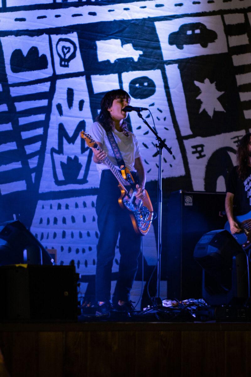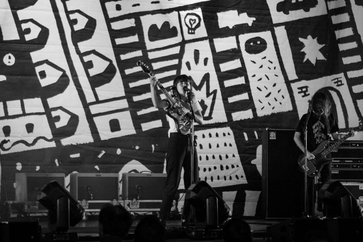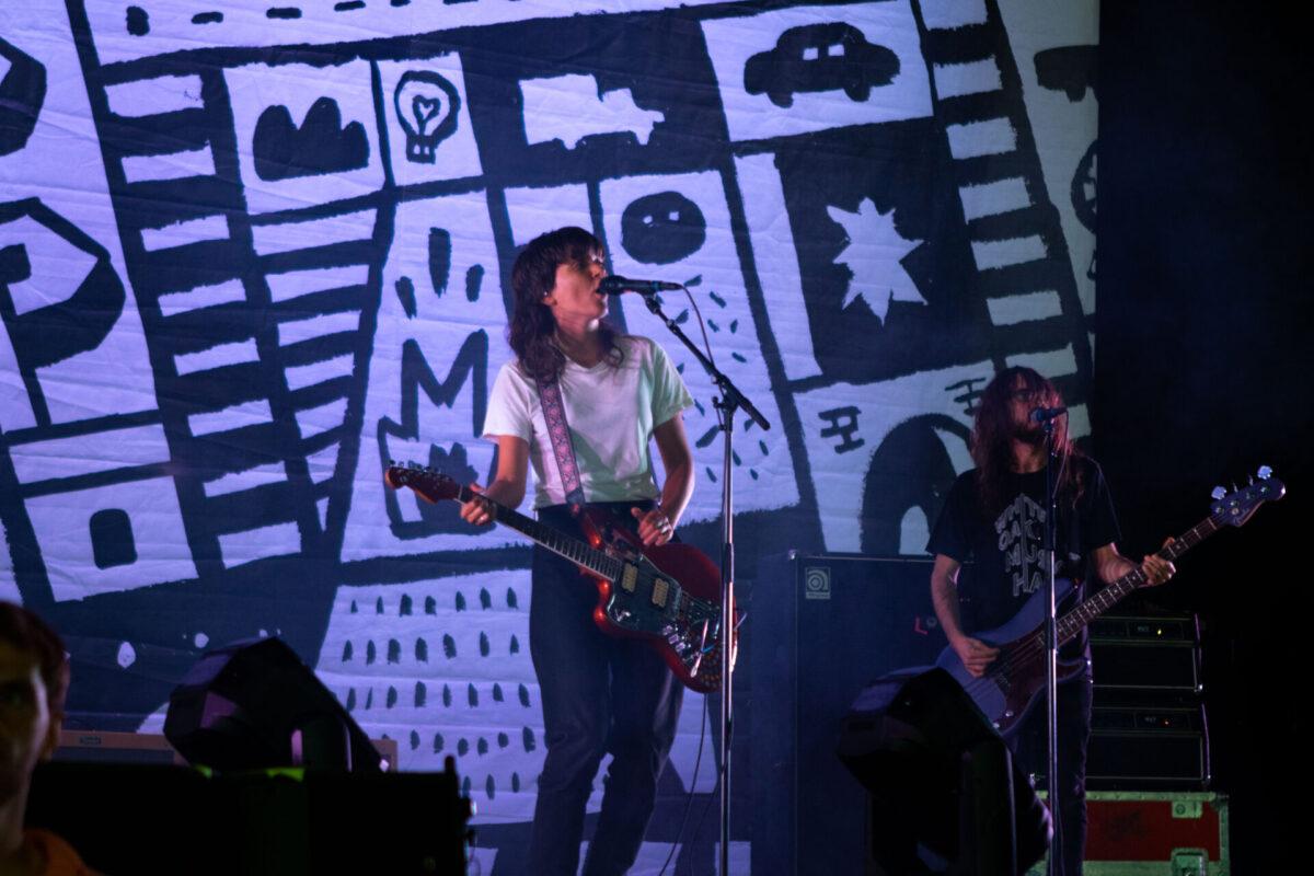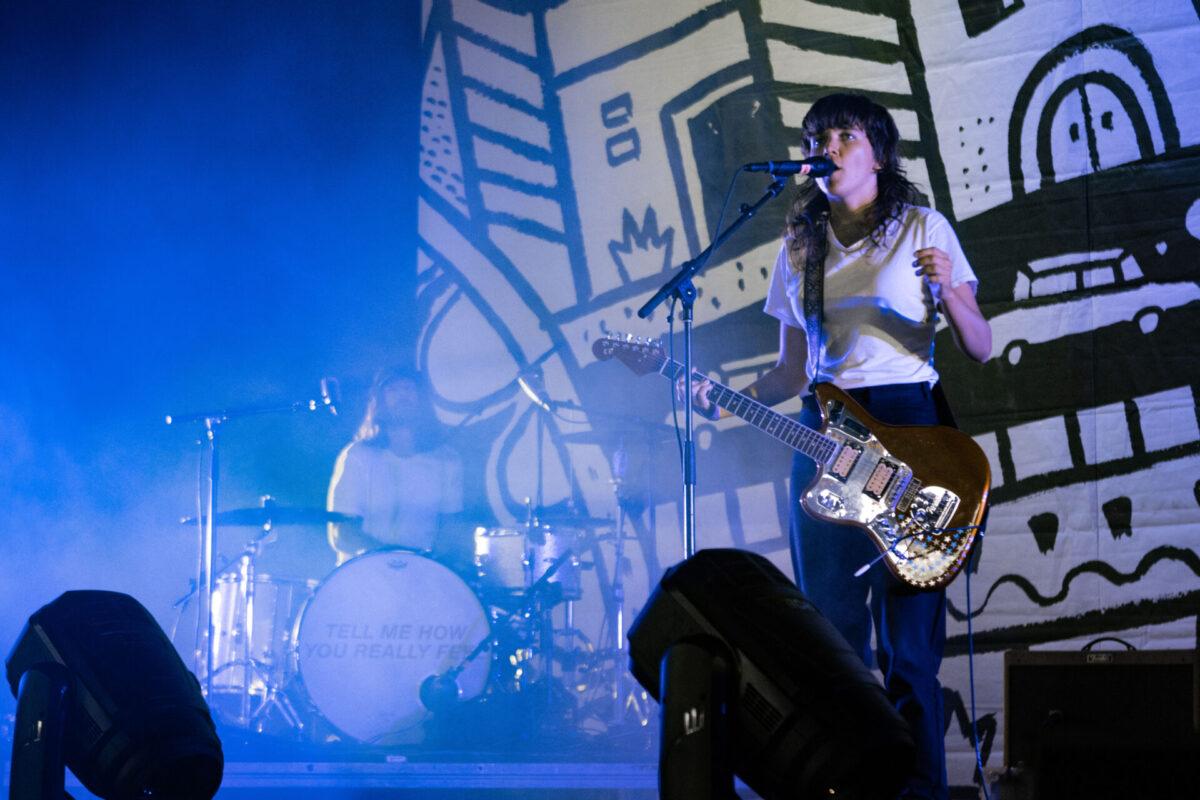 Barnett greeted everyone with a rousing “Well, good evening!” as the sun began to set and the crowd continued to grow. Her trio spread themselves far apart on the stage in front of a fabulous backdrop: a tall cloth screen displaying an urban sprawl in a black and white cartoon, flattened out like a cubist comic. Barnett let loose early with her guitar solo on the opener “Avant Gardener,” one of her oldest and most beloved hits. The band followed with “City Looks Pretty” from last year’s Tell Me How You Really Feel, and they kept pounding away with hardly any breaks between songs. Sometimes Barnett let her guitar feedback ring out indefinitely after a song ended; some of the songs collapsed into chaos, toppled over and sent the band tumbling into the next song without even a moment’s rest.
