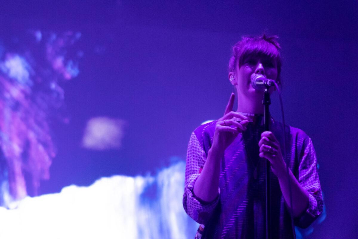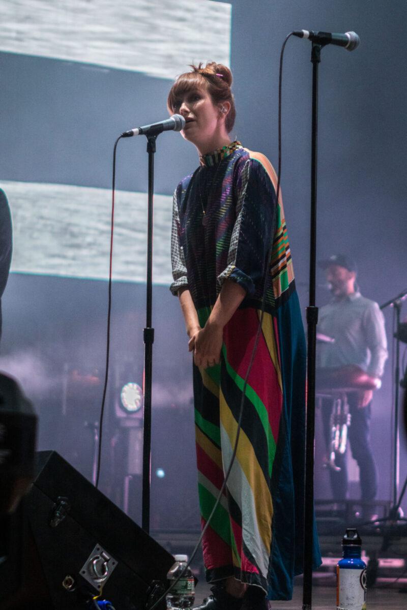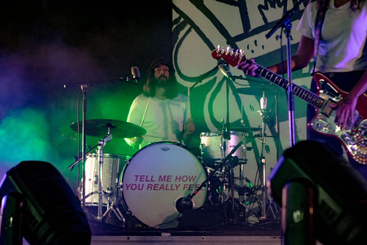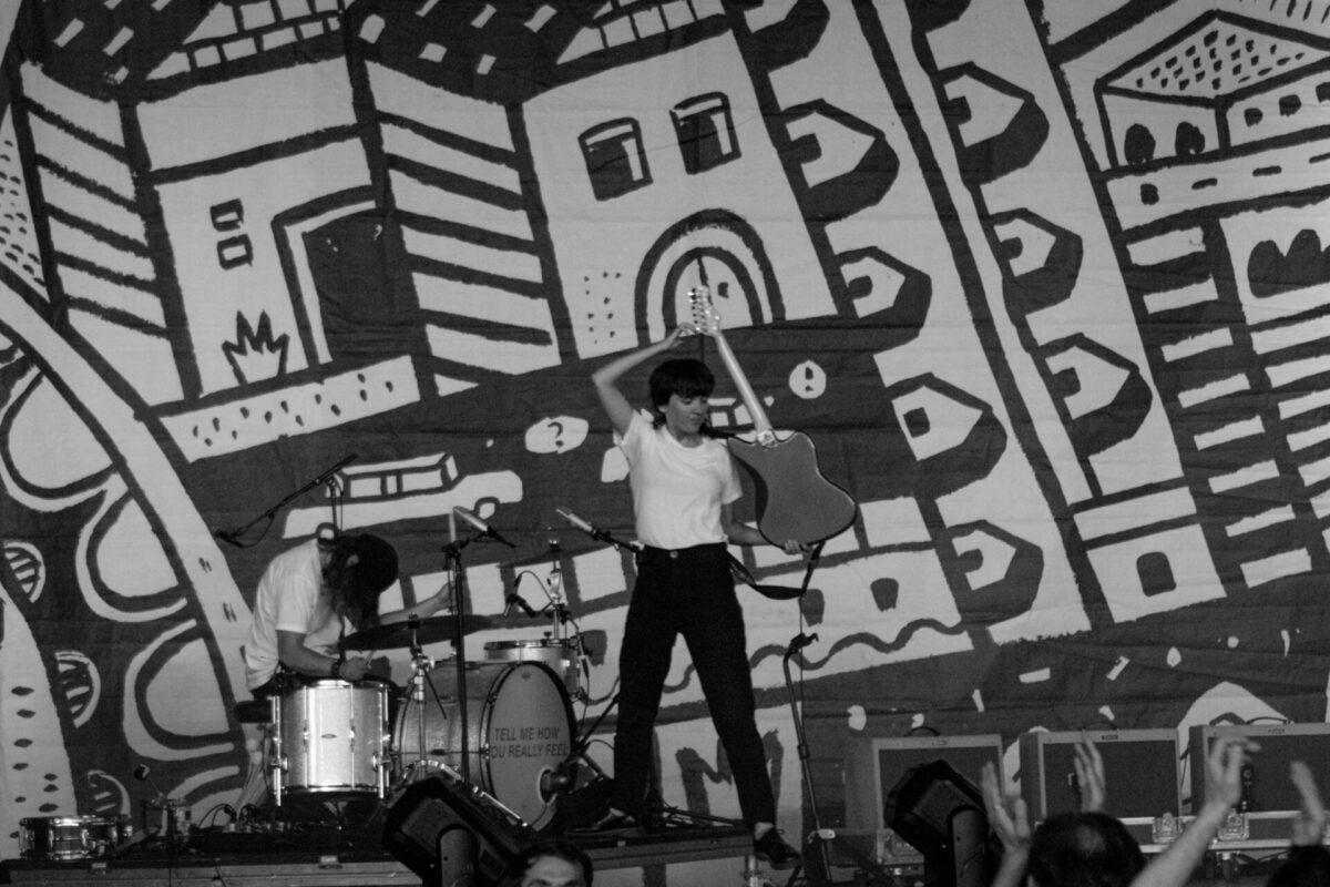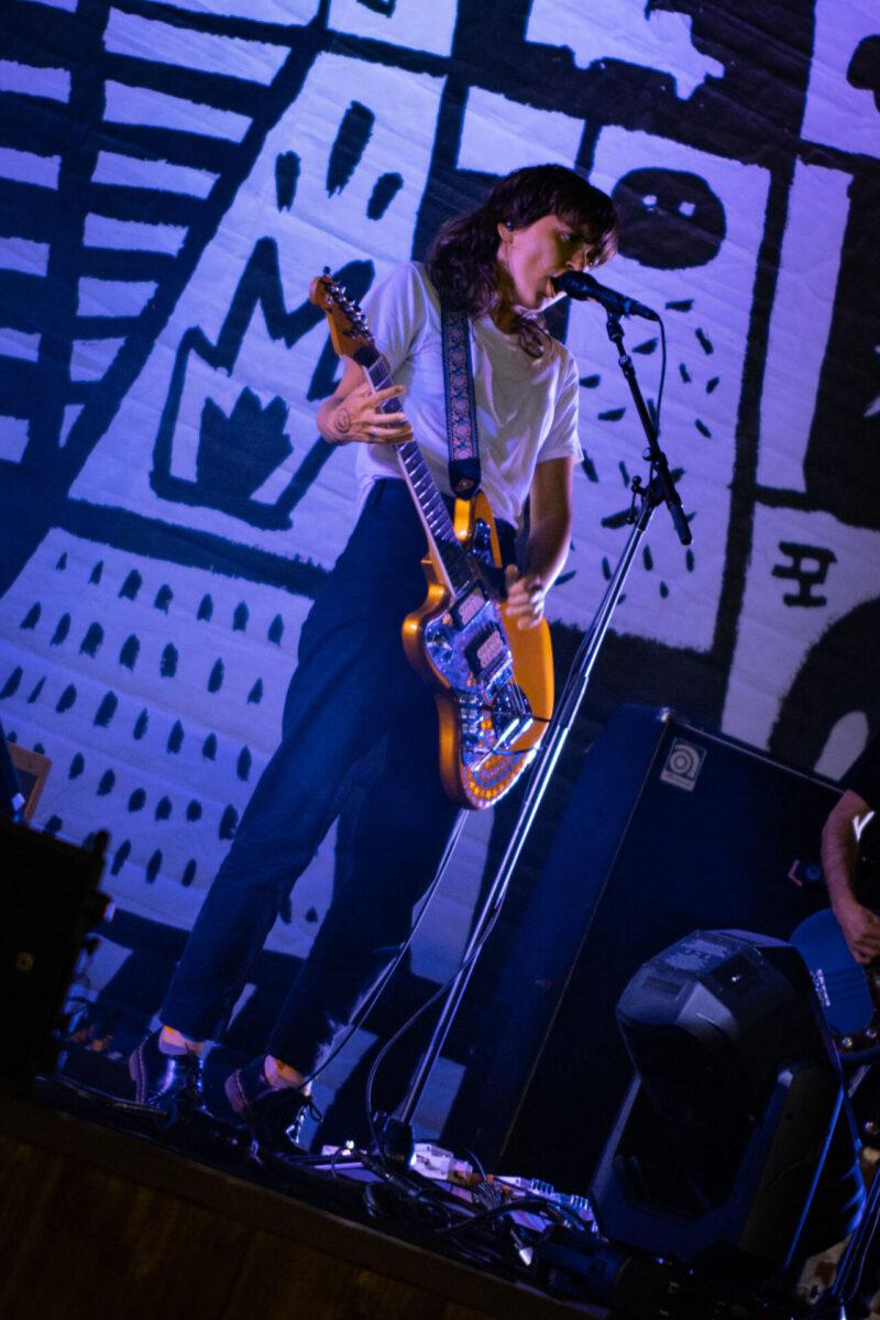 Barnett greeted everyone with a rousing “Well, good evening!” as the sun began to set and the crowd continued to grow. Her trio spread themselves far apart on the stage in front of a fabulous backdrop: a tall cloth screen displaying an urban sprawl in a black and white cartoon, flattened out like a cubist comic. Barnett let loose early with her guitar solo on the opener “Avant Gardener,” one of her oldest and most beloved hits. The band followed with “City Looks Pretty” from last year’s Tell Me How You Really Feel, and they kept pounding away with hardly any breaks between songs. Sometimes Barnett let her guitar feedback ring out indefinitely after a song ended; some of the songs collapsed into chaos, toppled over and sent the band tumbling into the next song without even a moment’s rest.