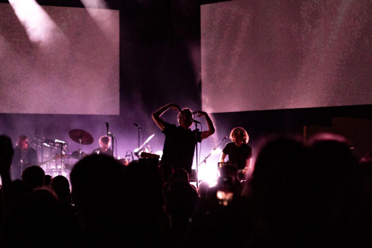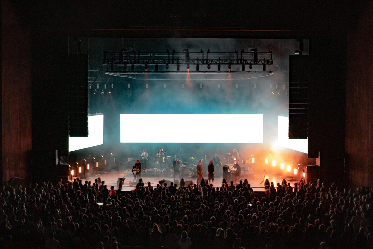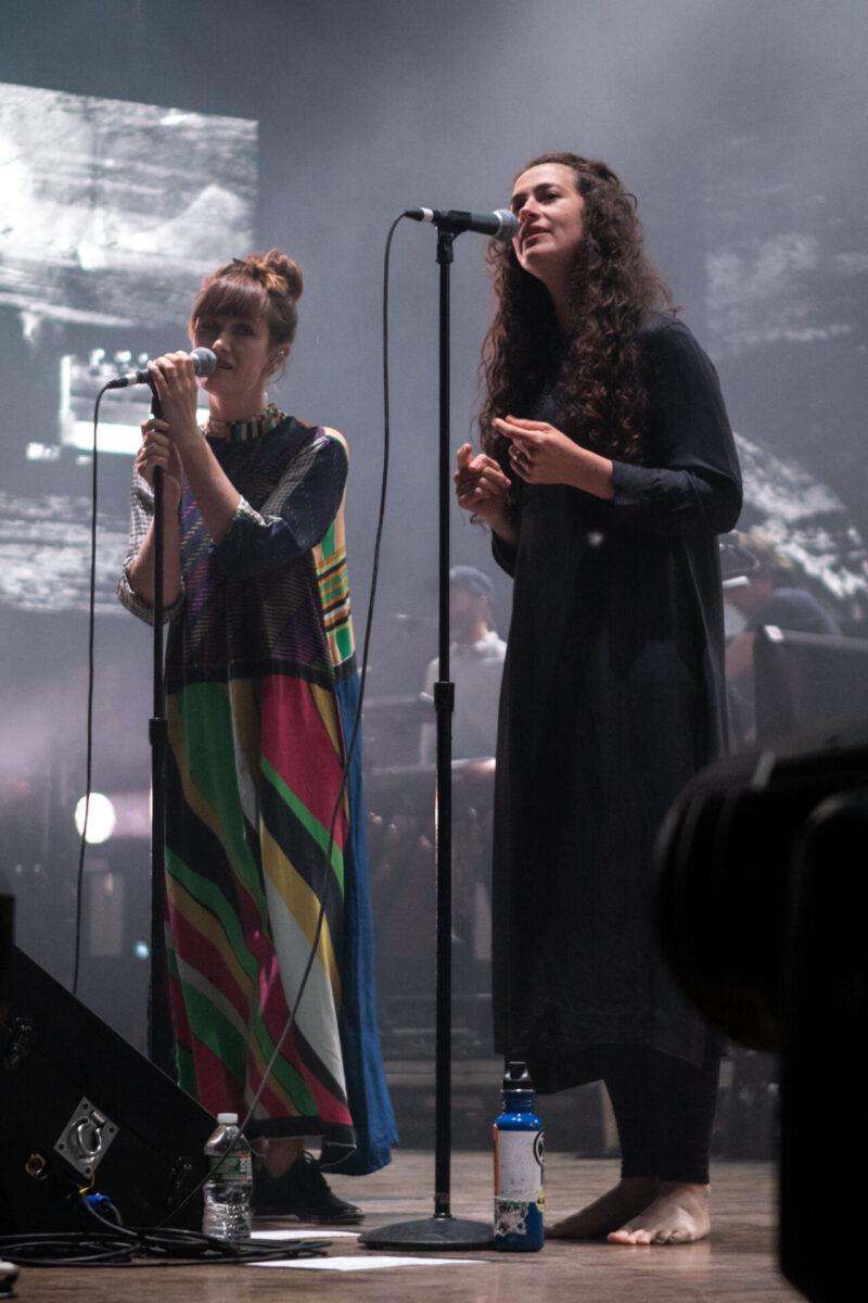 A rigorous overhaul took place on stage between sets in preparation for The National’s set, which featured the five longtime band members Dessner, Dessner, Devendorf, Devendorf and Berninger alongside several of the guests who joined them on I Am Easy to Find: singers Kate Stables (This Is the Kit) and Pauline de Lassus (Mina Tindle), drummer James McAlister (who worked with Aaron Dessner on 2018’s Big Red Machine and with Bryce Dessner on 2017’s Planetarium) and multi-instrumentalist Kyle Resnick (who has previously played with The National, Beirut, Sufjan Stevens and others). When the ensemble took the stage, three large LED screens above their heads lit up with fuzzy black and white graphics sliding back and forth. Berninger held a plastic red solo cup in his hand as he addressed the crowd blithely. “How’s it going, thank you for coming.”