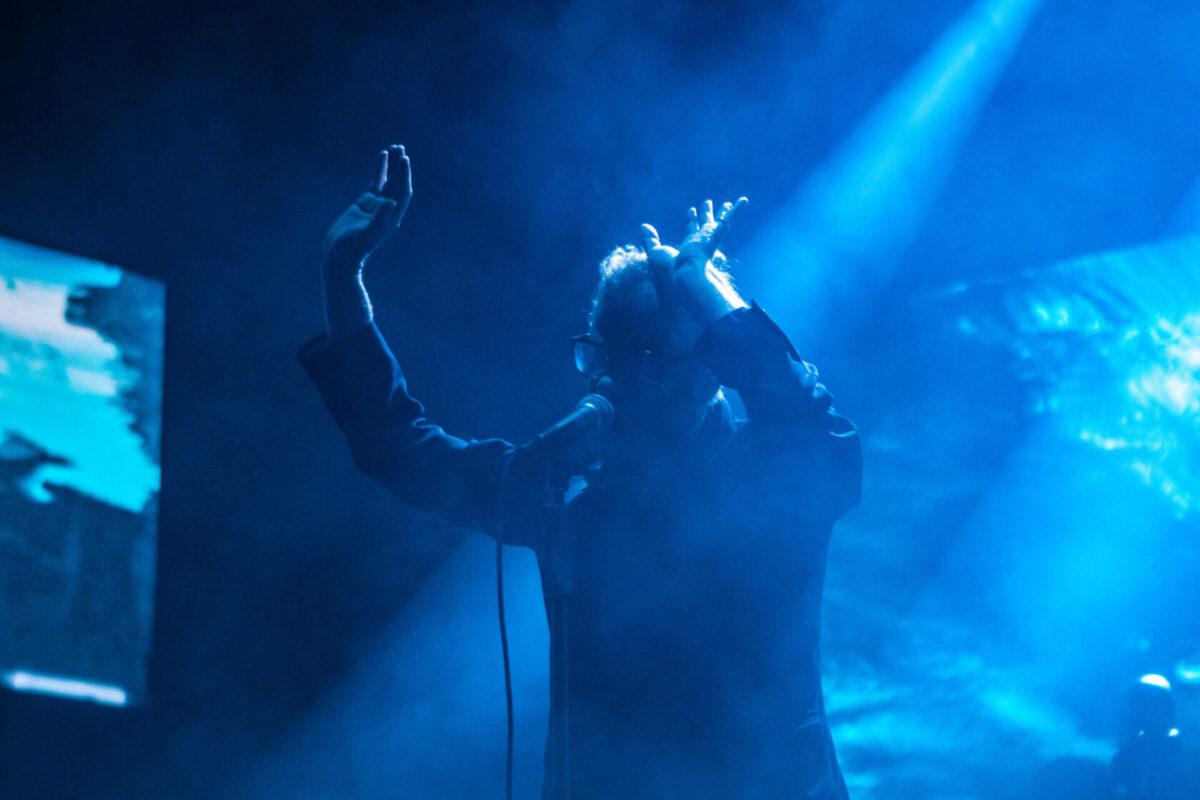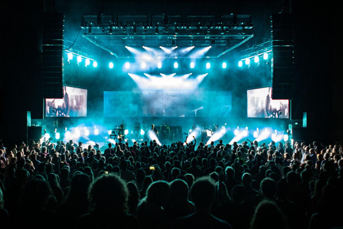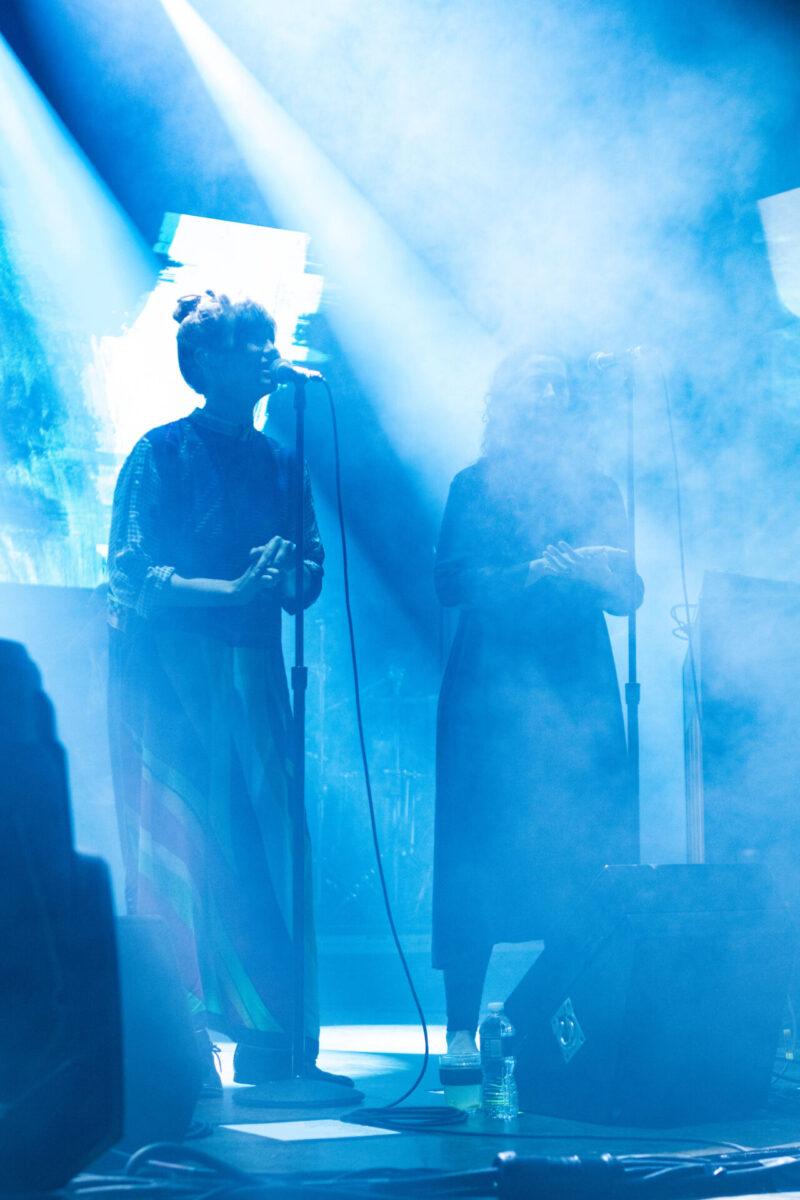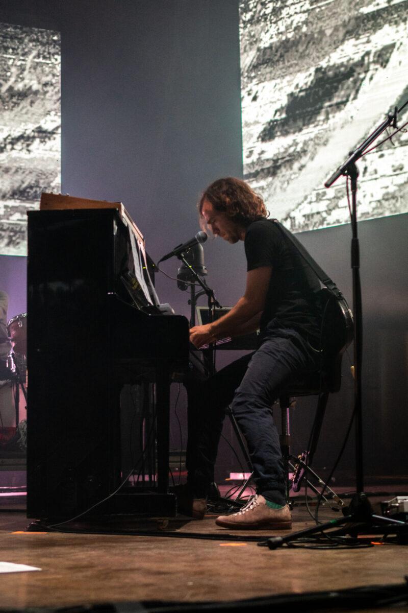 A rigorous overhaul took place on stage between sets in preparation for The National’s set, which featured the five longtime band members Dessner, Dessner, Devendorf, Devendorf and Berninger alongside several of the guests who joined them on I Am Easy to Find: singers Kate Stables (This Is the Kit) and Pauline de Lassus (Mina Tindle), drummer James McAlister (who worked with Aaron Dessner on 2018’s Big Red Machine and with Bryce Dessner on 2017’s Planetarium) and multi-instrumentalist Kyle Resnick (who has previously played with The National, Beirut, Sufjan Stevens and others). When the ensemble took the stage, three large LED screens above their heads lit up with fuzzy black and white graphics sliding back and forth. Berninger held a plastic red solo cup in his hand as he addressed the crowd blithely. “How’s it going, thank you for coming.”